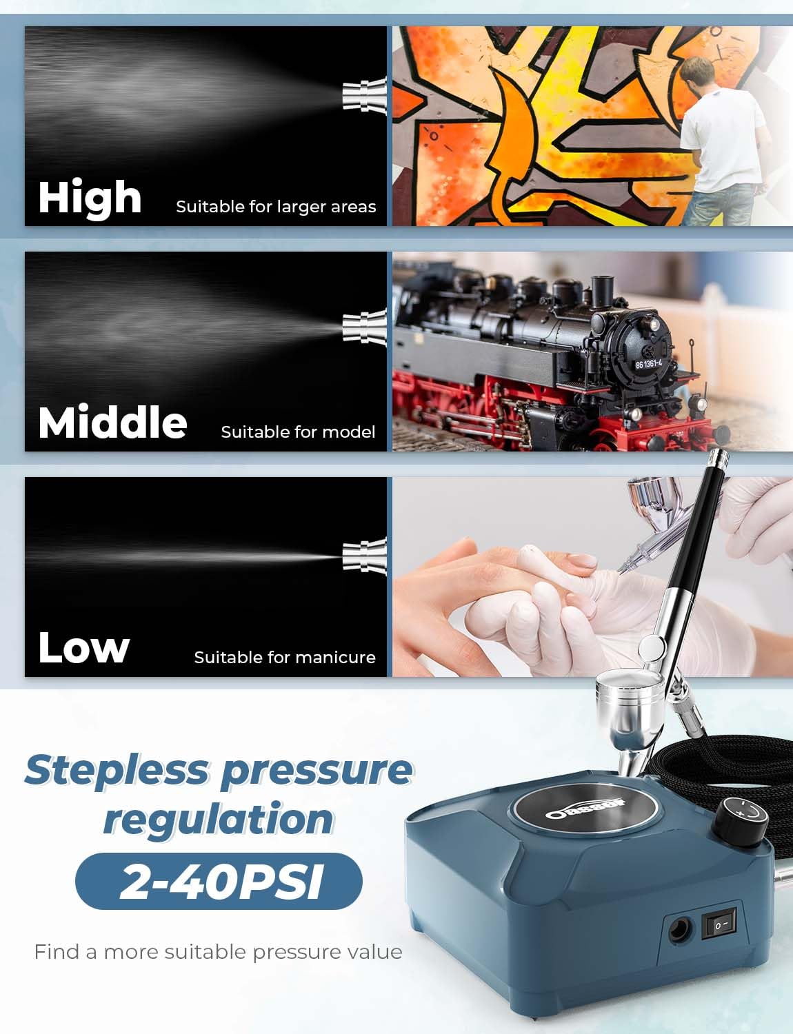 • Adjustable High-Pressure Spray: our airbrush reaching 10.5L airflow that ensures a smooth, consistent flow, with a stepless pressure adjustment knob (from 2 to 40PSI) for fine-tuning airflow to meet different spraying work