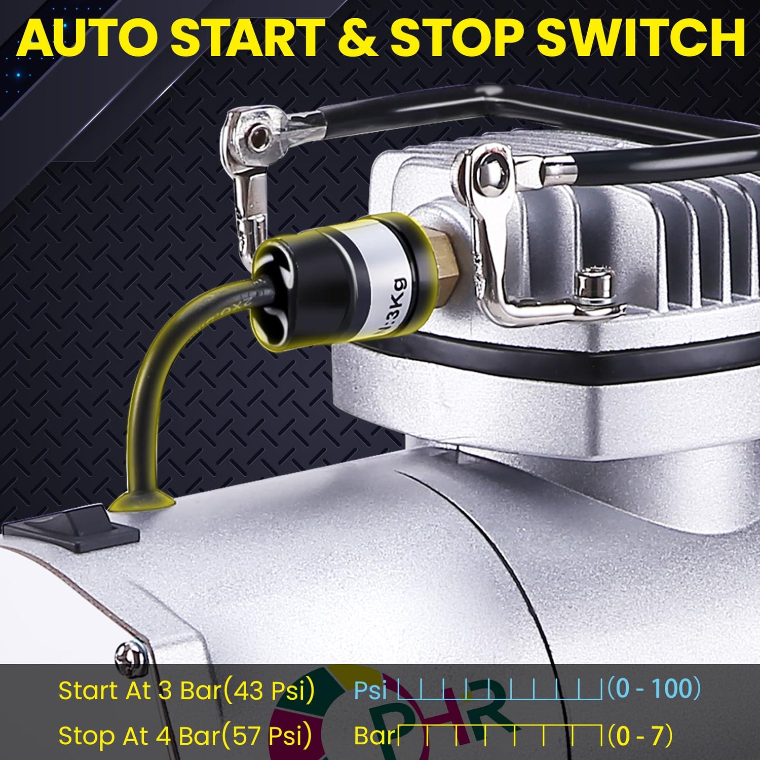 - 【Auto Start/Stop Switch】There is a switch for auto start and stop functionality, which will make the air more stable. Start at 3Bar(43psi) and stop at 4Bar(57psi). Provide clean and dry air for your airbrushing work.