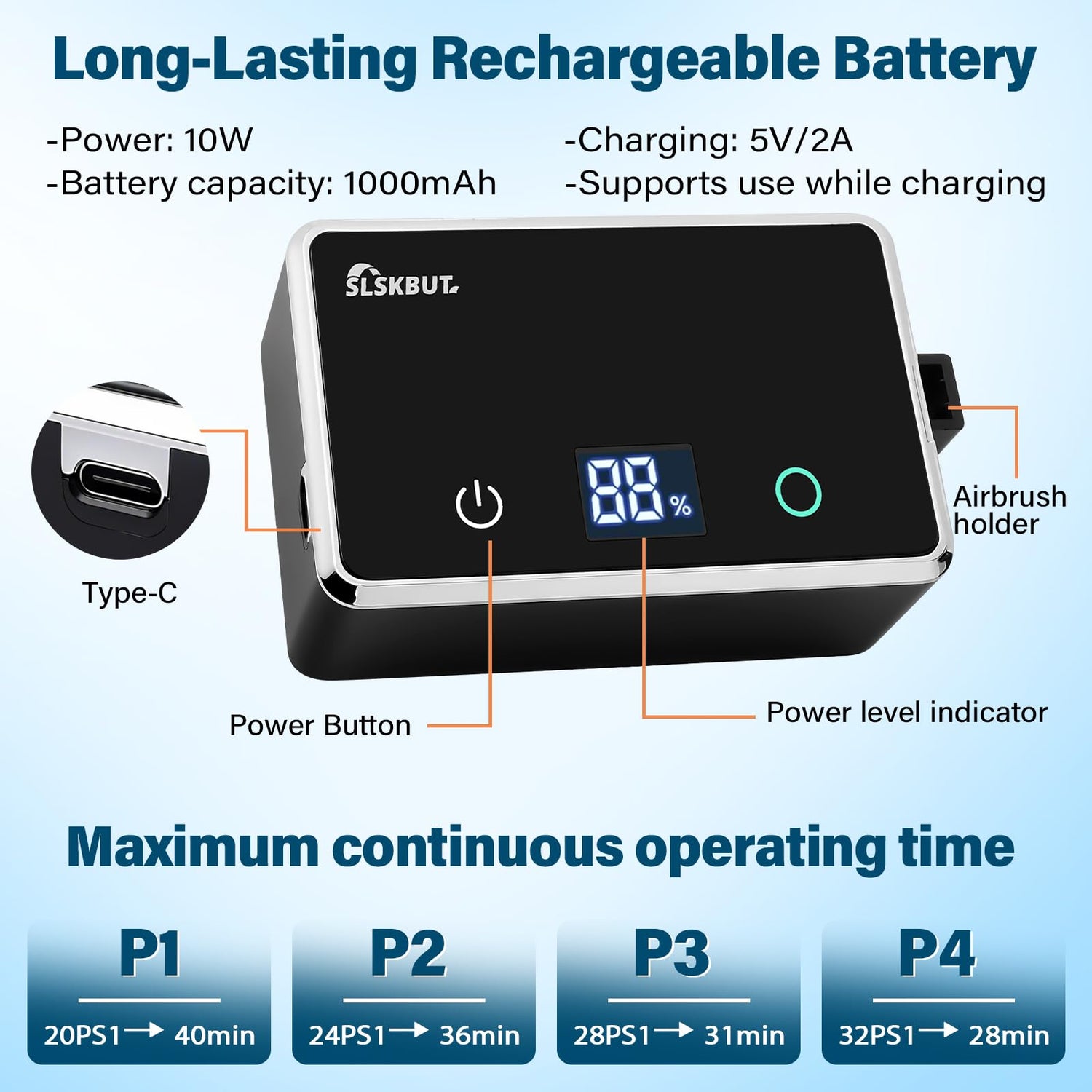 • Quick Charge & Reliable Performance: Equipped with a high-efficiency battery, this airbrush set achieves a full charge in just 30 minutes via the included Type-C charging cable (compatible with laptops, power banks, or USB chargers). Enjoy 20-40 minutes of continuous runtime—sufficient to complete most projects without interruption. Note: Be sure to use a 5V/1A or 5V/2A adapter to avoid damaging the battery!