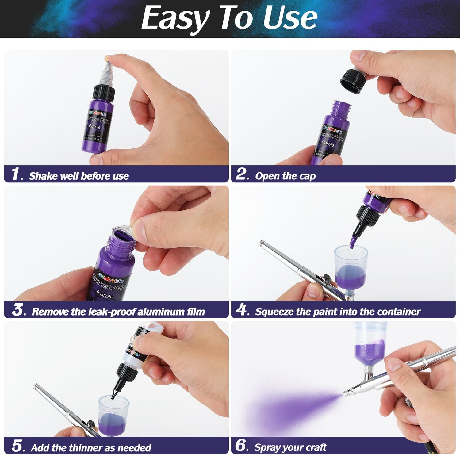 - 【Ready to Spray】Airbrush paints set is ready to spray, easy to use. Each air brush color has wonderful air brush flow characteristics. You can easily control the dosage when DIY your projects with our airbrush kit. Airbrush paint mixes easily, dispenses well, it may be too thick for airbrush use straight from the vials. Air brush paint works nicely on paper, not mottling. It may needs to be thinned for a typical airbrush application