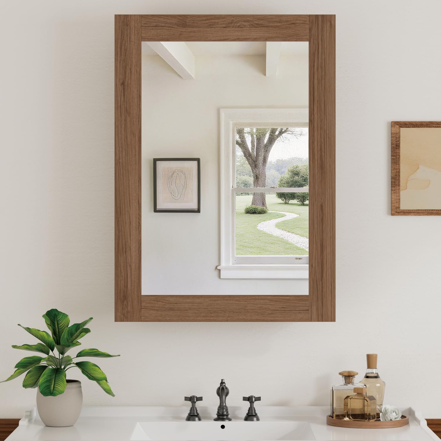 24 x 30 Inch Walnut Grain Medicine Cabinet with Mirror, Recessed or Wall-Mounted Wood Storage Cabinet for Bathroom, Adjustable Shelves, Soft-Close Hinges, Rectangle