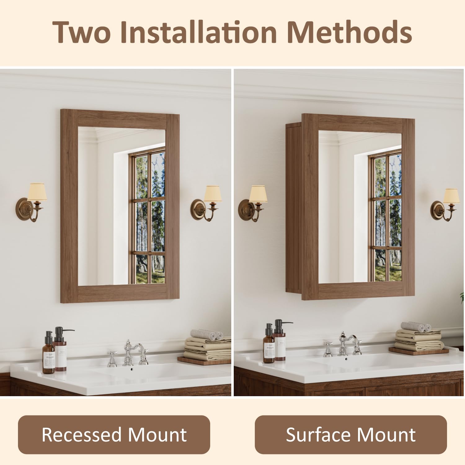 - Versatile Installation: Designed for both wall-mounted or recessed installation, this walnut grain medicine cabinet seamlessly blends into any bathroom layout, optimizing bathroom storage space without compromising style