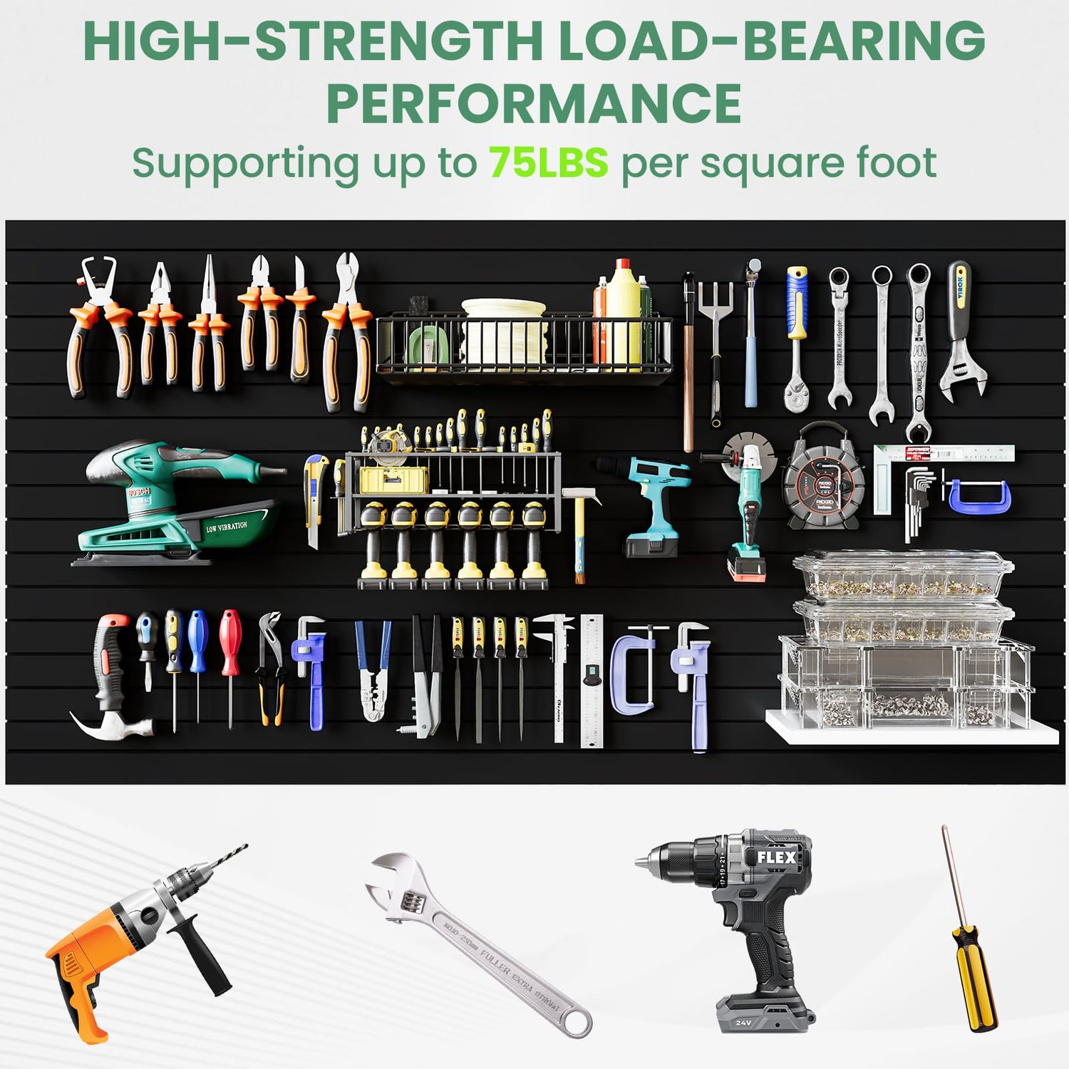 • 【Strong Load Bearing】Supports 75lbs per mounting point when correctly installed. Ideal for garages, workshops, gyms, offices and more. Perfect solution for storage and organization.