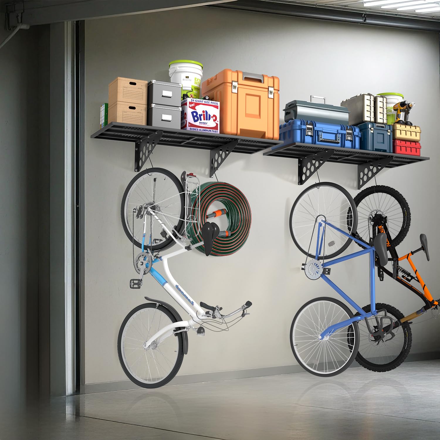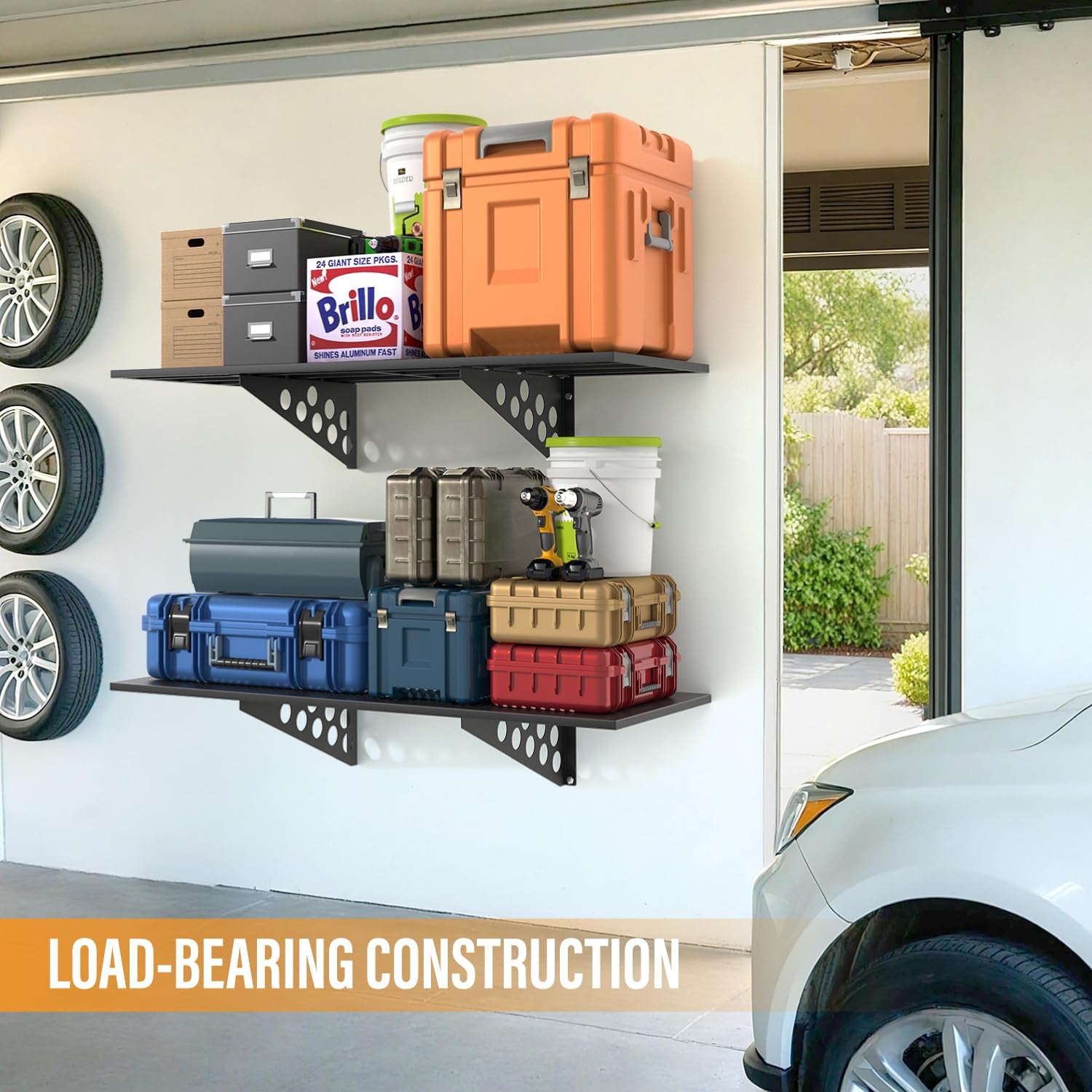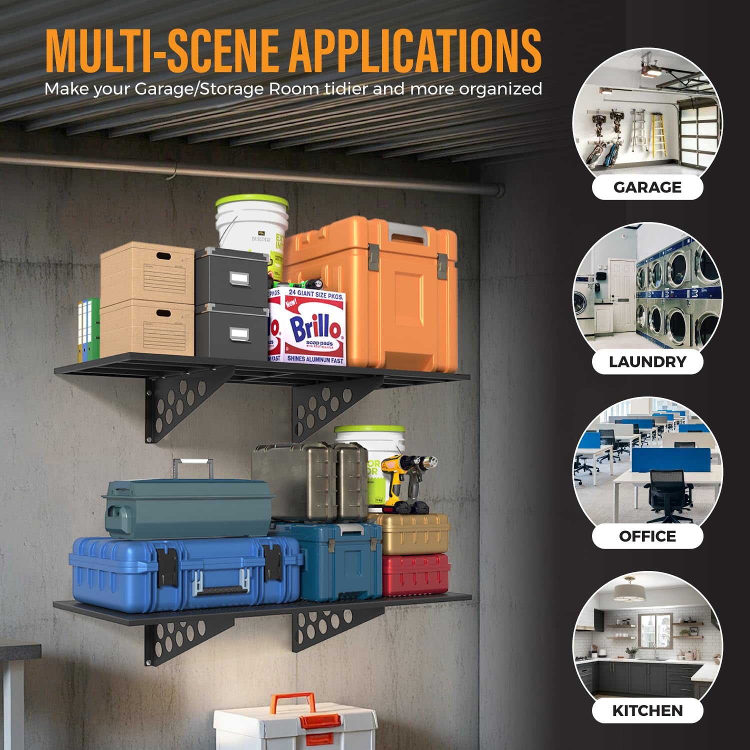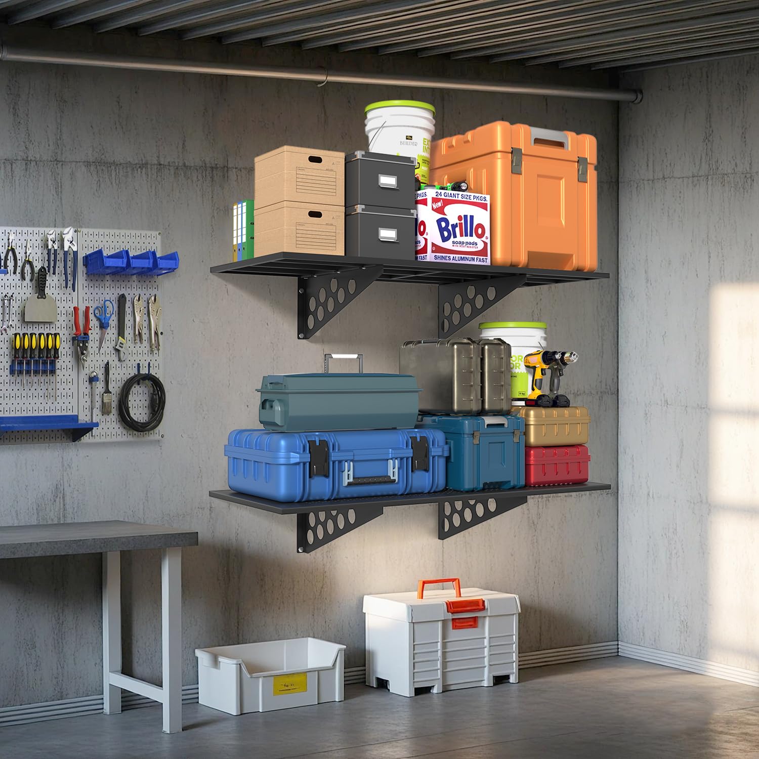 - STORAGE IN THE HOME LOGISTICS: Organize your home space with these sturdy wall mounted shelves to store bins, tools, boxes, sports equipment, tires, etc.