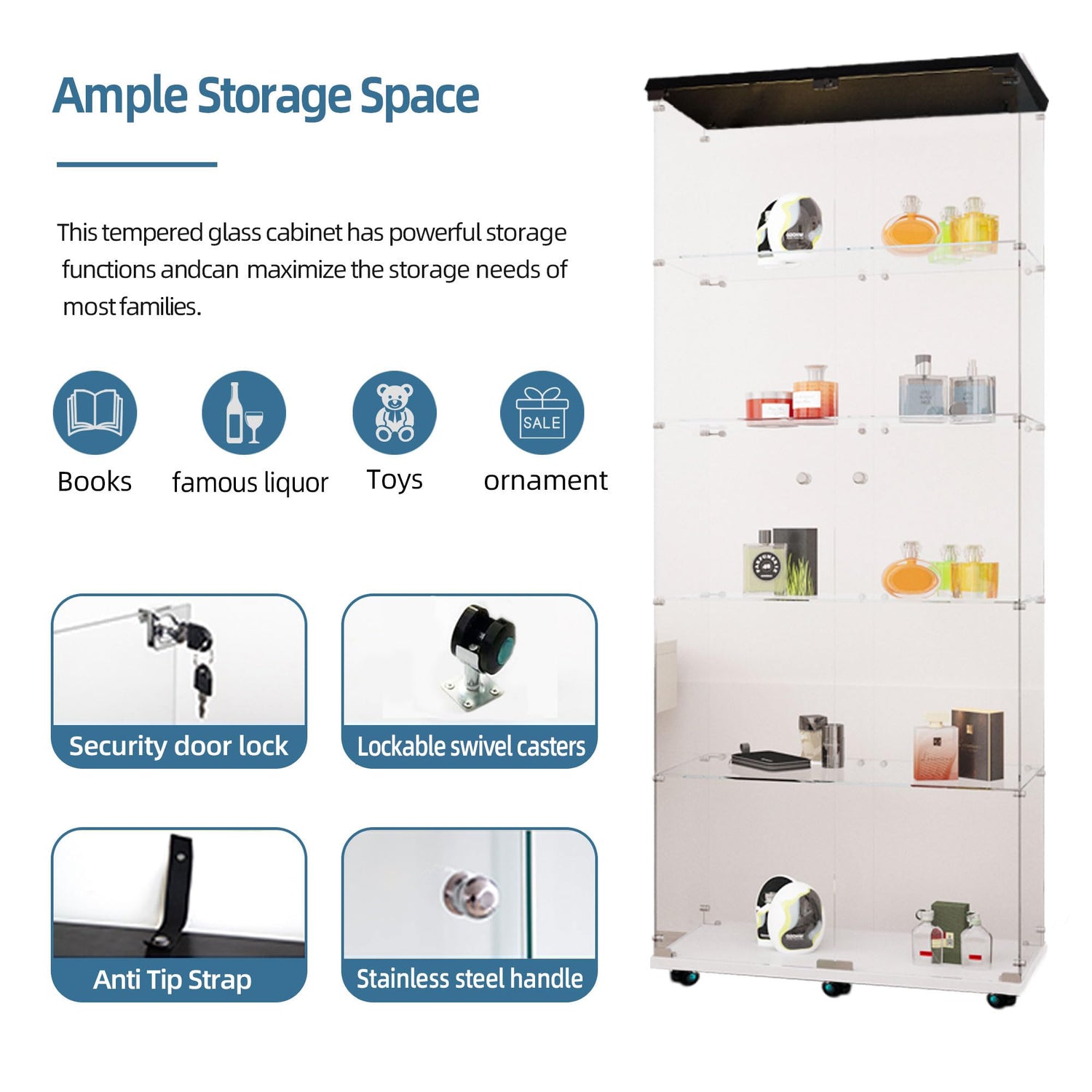 - Strong and Stable Structure: The display case cabinet is made of high-strength tempered glass and solid engineering wood, which ensures the stability and load-bearing capacity of the structure, and has good scratch resistance and prolonging the service life. The selection of high-quality connectors and hardware accessories can ensure the smooth opening and closing of the cabinet door.