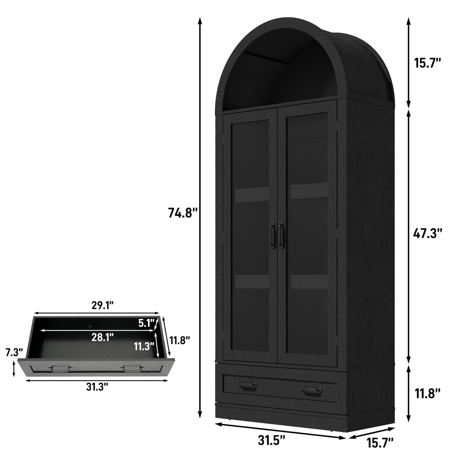 75" Tall Arched Kitchen Pantry Cabinet w Load-Bearing Steel Pipe,Modern Farmhouse Kitchens Storage Cabinet with Drawer and Glass Doors,Tall Arched Bookcase,Pantry Organizer(Woodgrain Black)