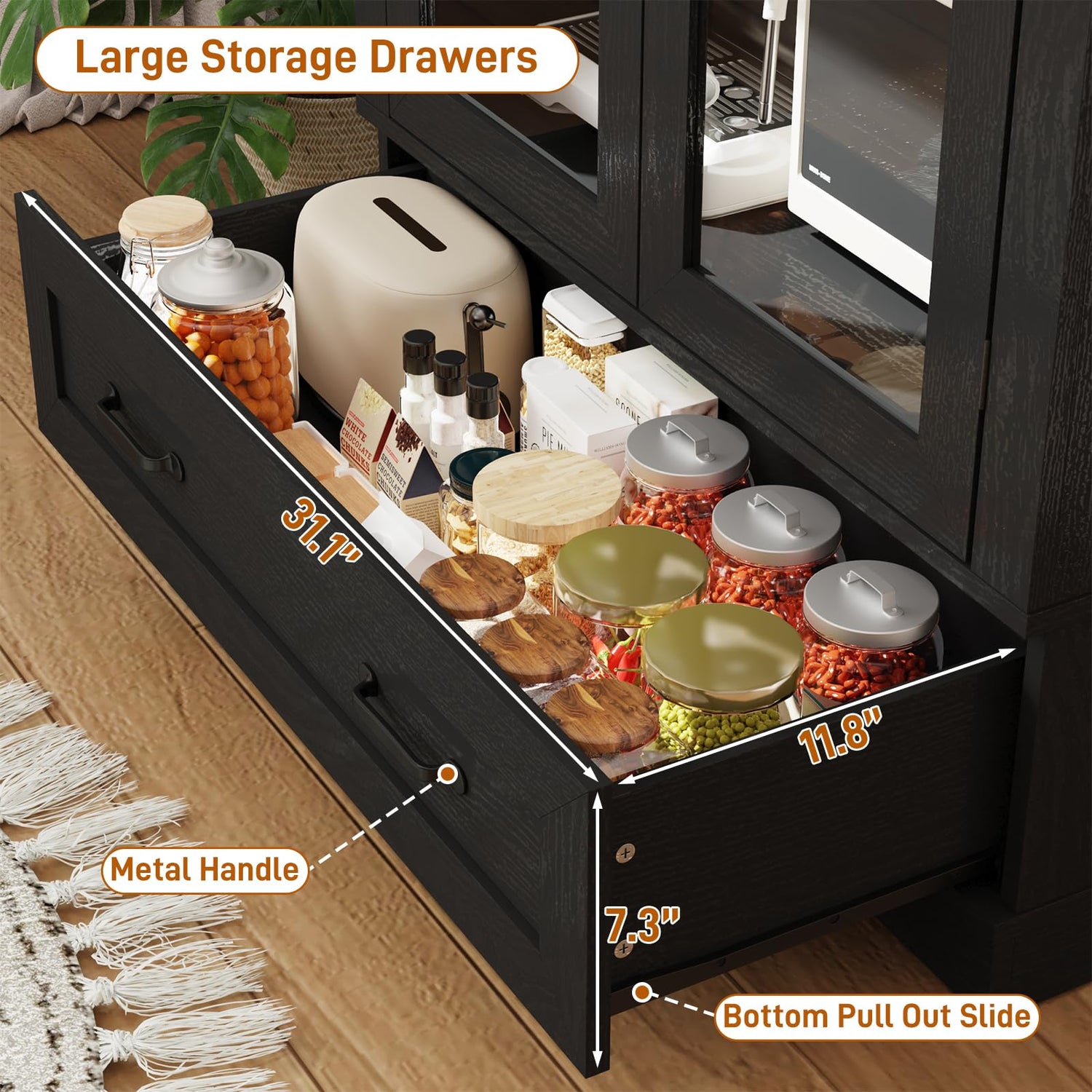 - Stable Structural: This farmhouse wood storage cabinet is made of Sturdy P2 engineered wood and metal,Fully floor-standing solid base,that is steadfast and wobble-free,able to withstand the challenges of long-term use.Featuring open large drawers, and closed compartments, this vaulted pantry cabinet offers ample space for all your essentials.
