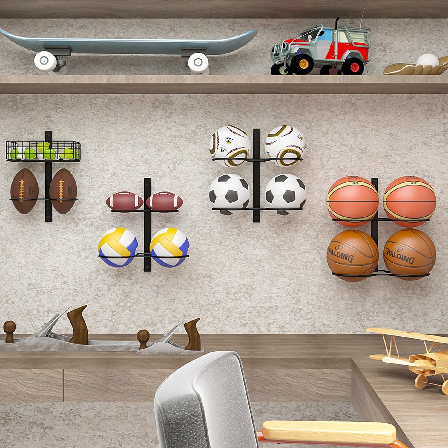 - DIY Basketball Stand】:This basketball stand can be assembled into different structures according to the requirements of space use, such as DIY assembled into 1/2/3/4 section wall mounted ball rack. Suitable for narrow space, can be installed in bedroom nightstand, living room display rack, ball storage garage, basement, gym and tool room, etc.