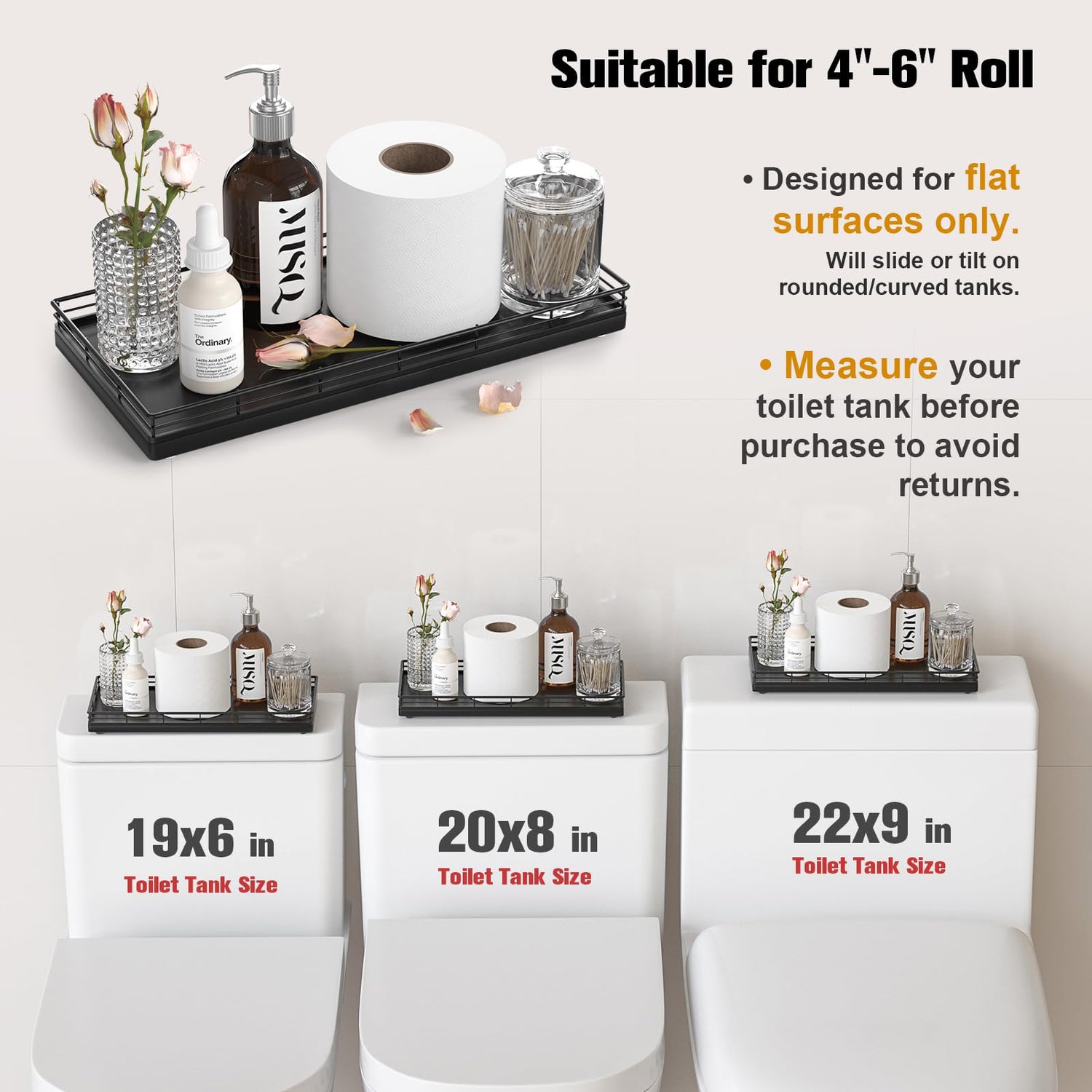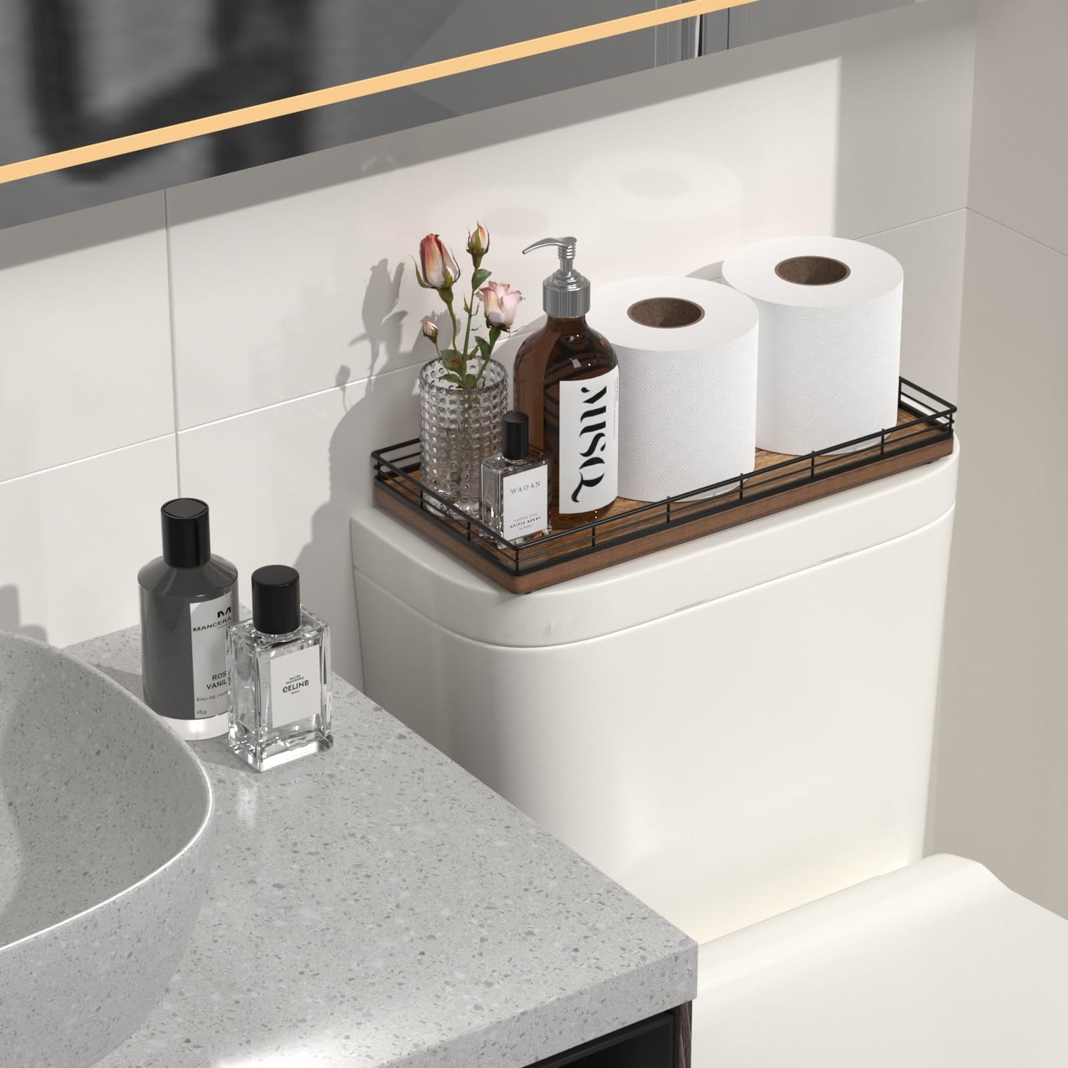 - Versatile Functionality: Elevate your daily routine with our toilet tank basket tray; Neatly arrange bathroom essentials such as toilet paper, lotions, scented candles and potted plants, keeping your countertop tidy; Add a touch of elegance to your dresser by using the bathroom vanity tray to display perfumes, jewelry, and cosmetics; Impress your guests with neatly arranged hand towels and toiletries organized on the large toilet tray for bathroom counter or use it as a kitchen soap tray