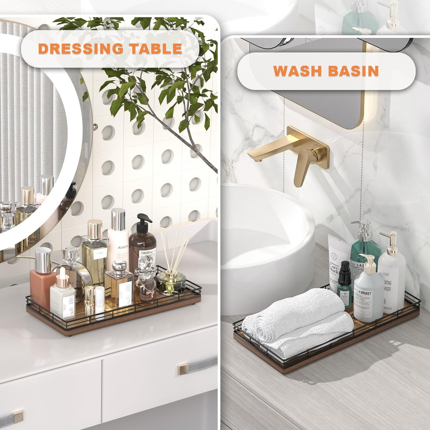 - Considerate Design: This bathroom trays for counter is ready to use without any installation required; Upgraded embedded welding design enhances stability and aesthetics; Raised edge prevent items from slipping; 4 non-slip pads on the bottom protect surfaces from scratches; Simplify your cleaning routine with just a quick wipe-down using a damp cloth, saving you time and hassle
