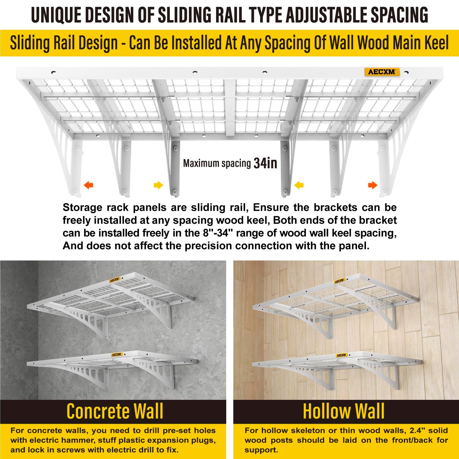 - Innovative Design: Unlike fixed-spacing systems, Aecxm garage storage shelves wall mounted feature sliding rail screws, allowing installation on wood studs spaced anywhere within the 36-inch garage shelf length. No more compatibility issues with uneven stud spacing