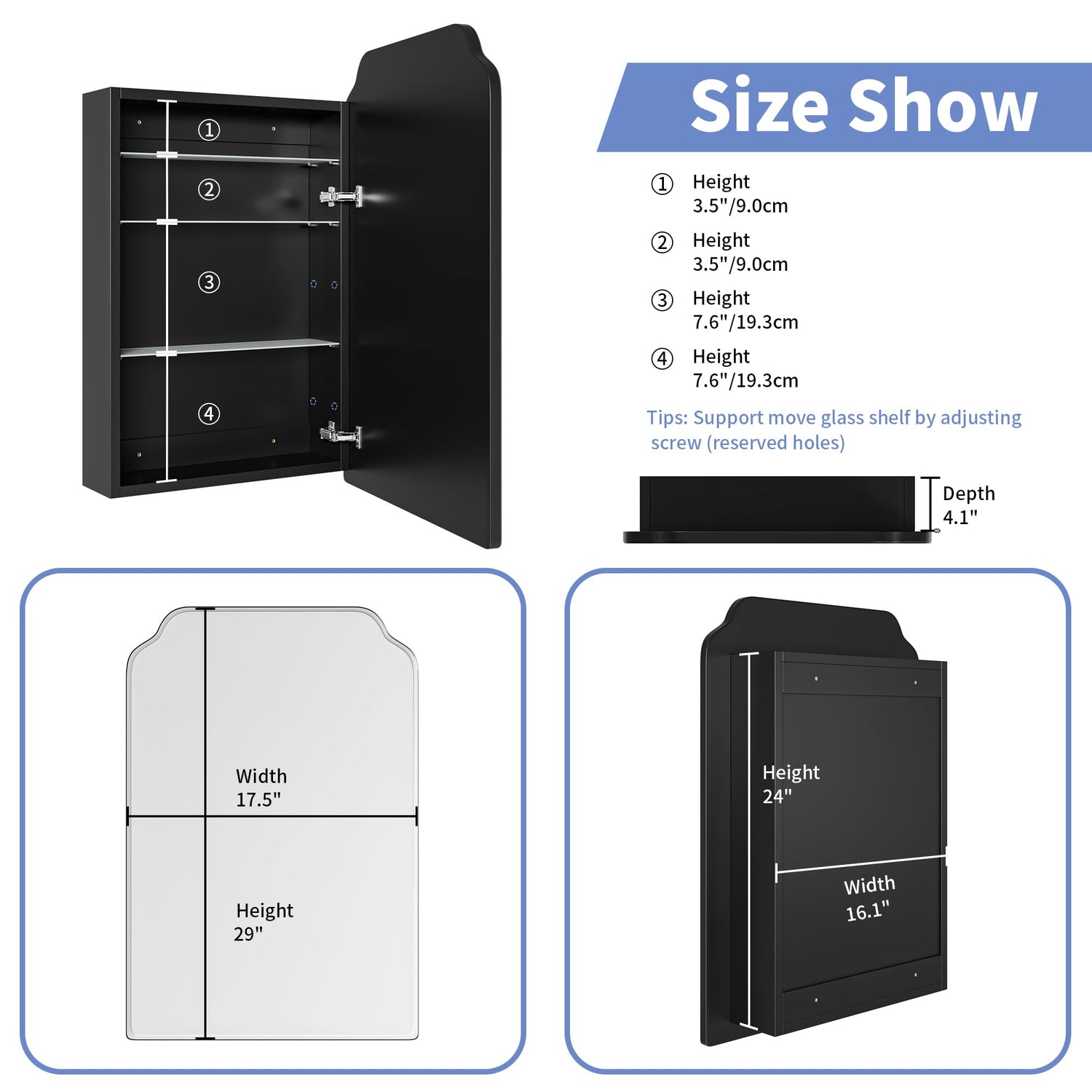 - Diversified Storage Space: The 29’’H x 17.5’’W medicine cabinet is equipped with 3 adjustable tempered glass shelves, providing customizable bathroom storage space. It is beneficial to store items of different heights.