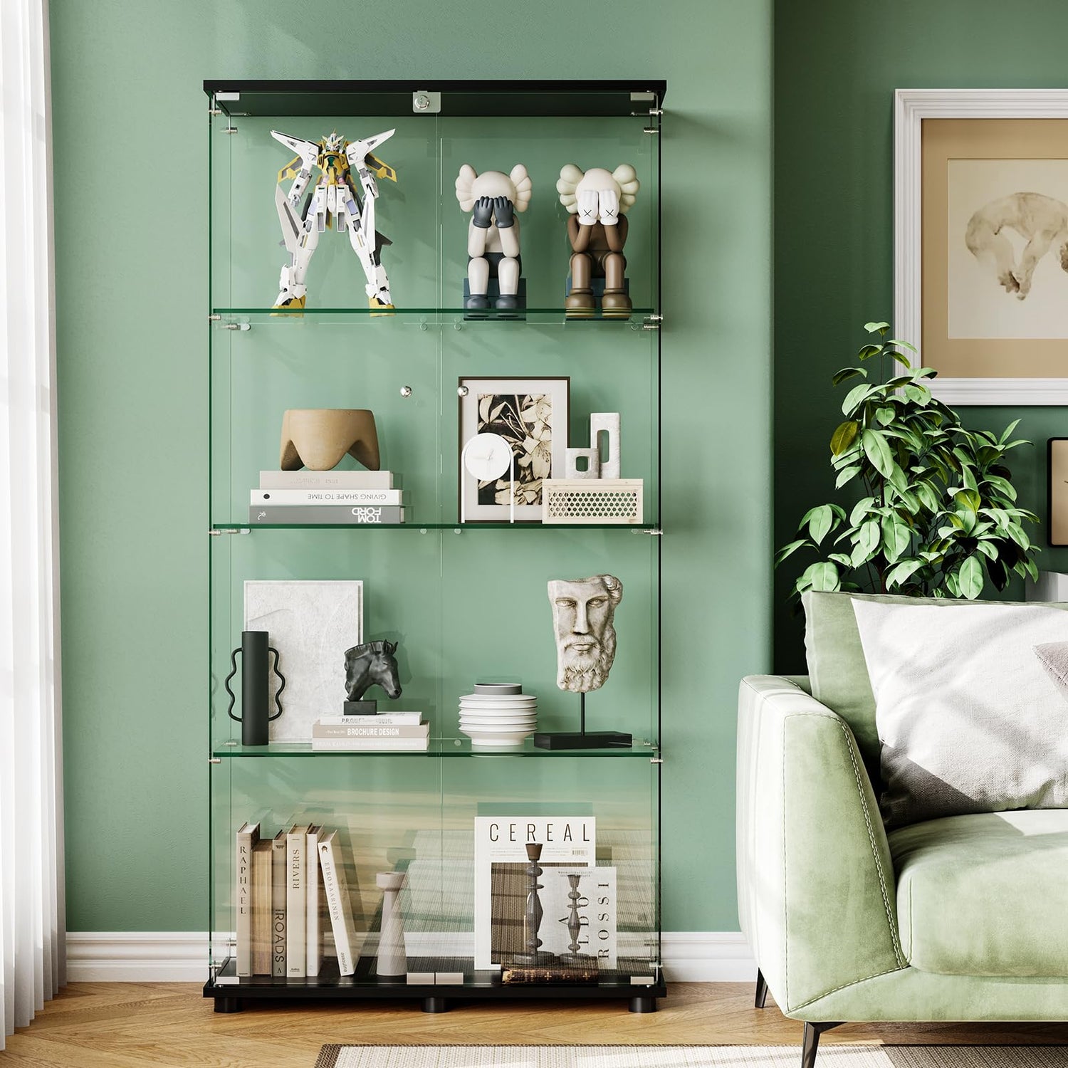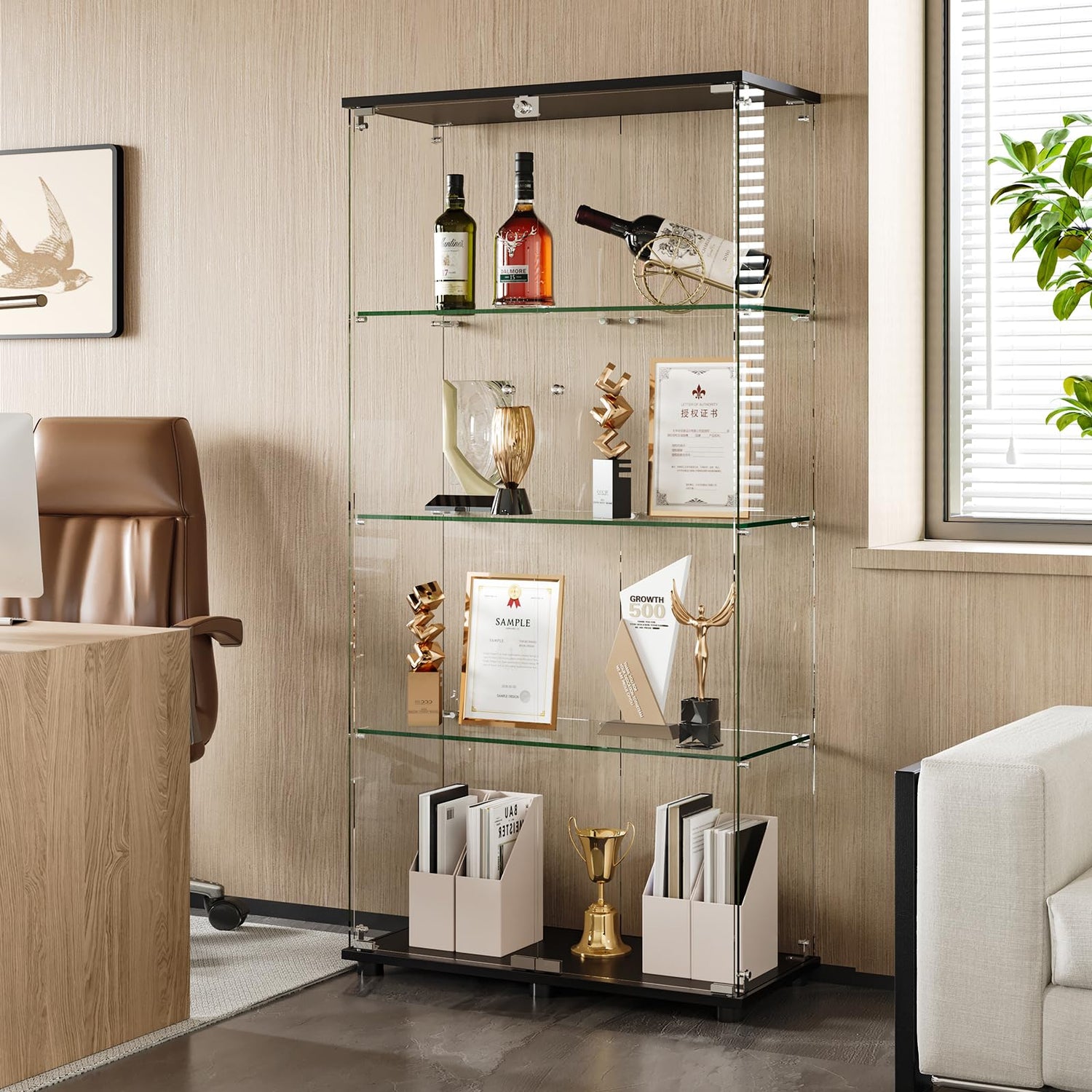 ahomrt Glass Display Cabinet with 4-Shelf Double Doors and Lock, 5mm Tempered Glass Floor Standing Bookshelf for Living Room, Bedroom, Office, 64 x 31.7 x 14.3 in, Black