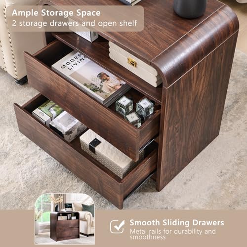 Aitjunz 25" Tall Modern Nightstand with Charging Station, 23.6'' Wide Wood Bedside Table w/2 Storage Drawers, Large Mid Century End Table for Bedroom, Living Room, Curved Profile Design, Brown