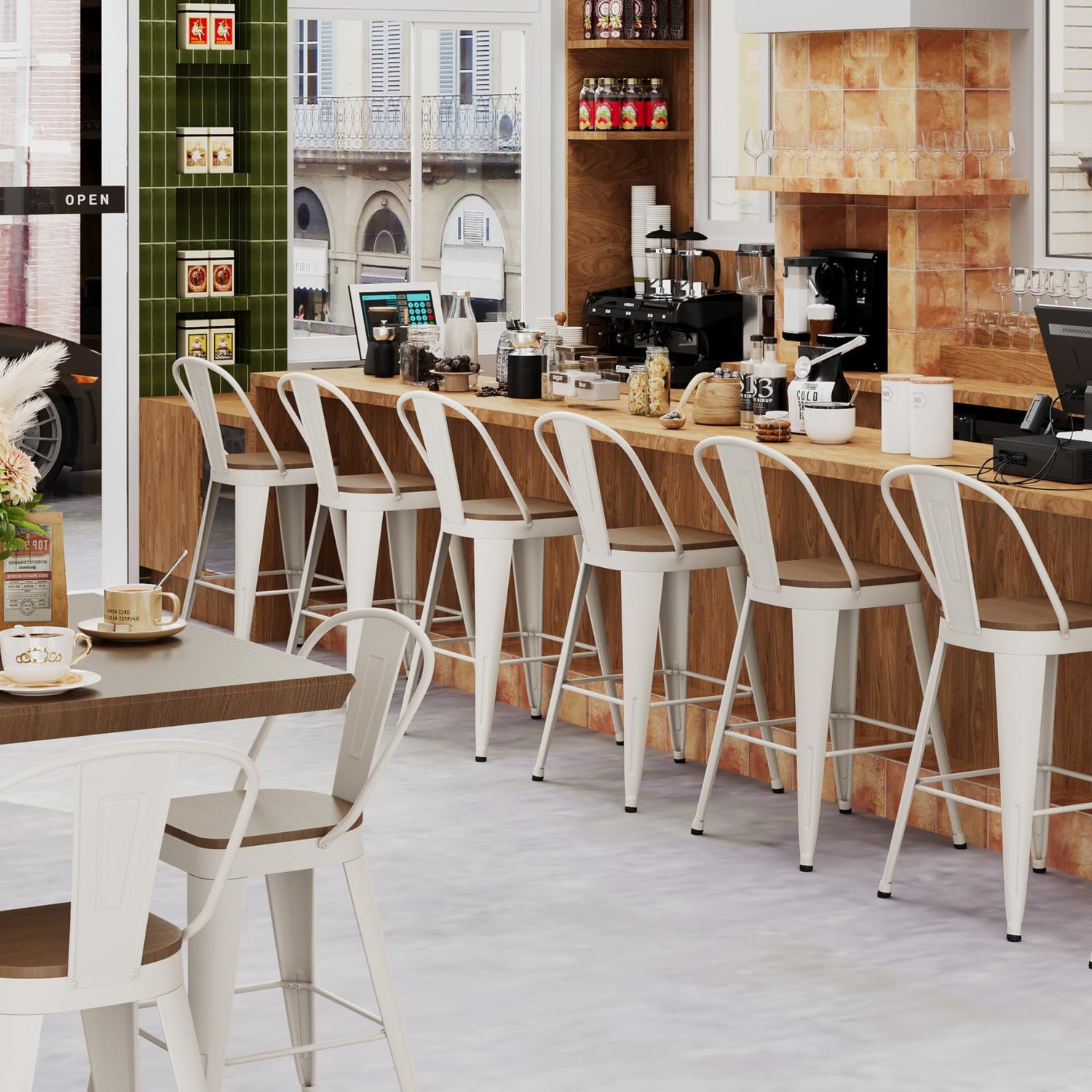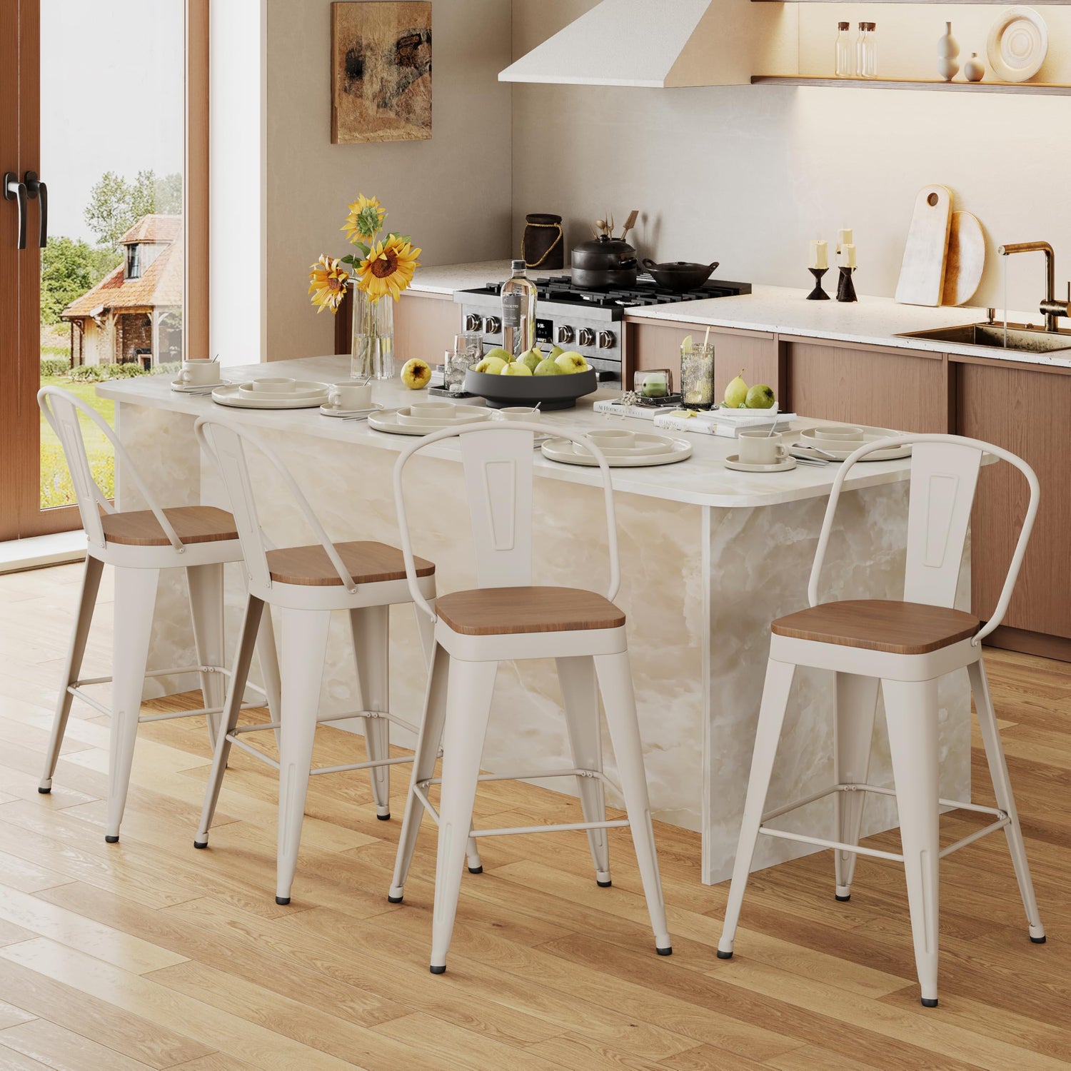 Andeworld Metal Bar Stools Set of 4, 24 inch Counter Height Barstools with Backs Farmhouse Modern High Back Bar Stools with Larger Seat Kitchen Dining Bar Chairs,Off White