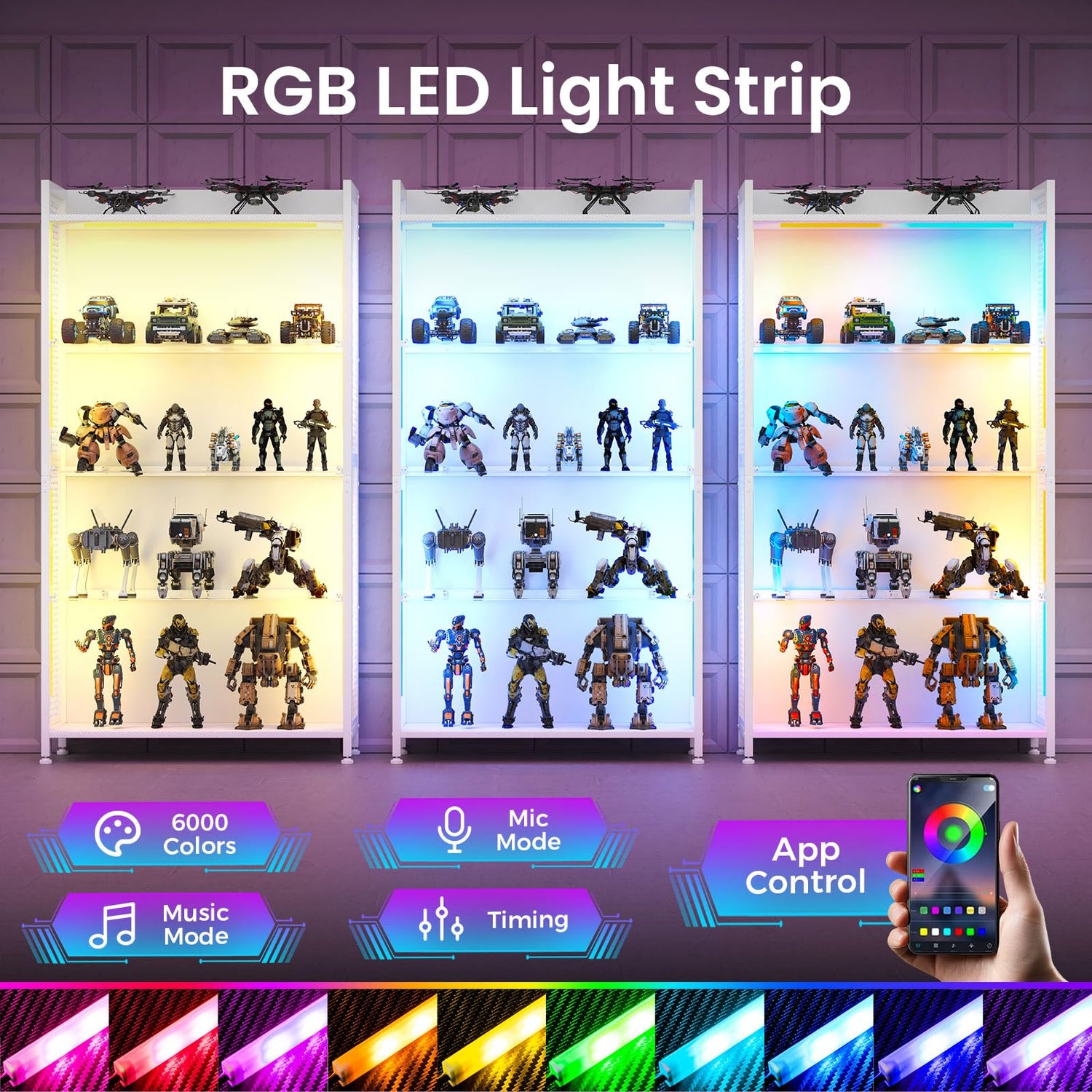 - 【Vivid RGB Lighting with APP Control】Transform your space with 5 bright LED strips, offering 6,000 vibrant colors via easy-to-use APP control. Choose from stunning dynamic effects or let the music sync mode pulse to your favorite songs, creating an immersive atmosphere that makes your collection come alive.