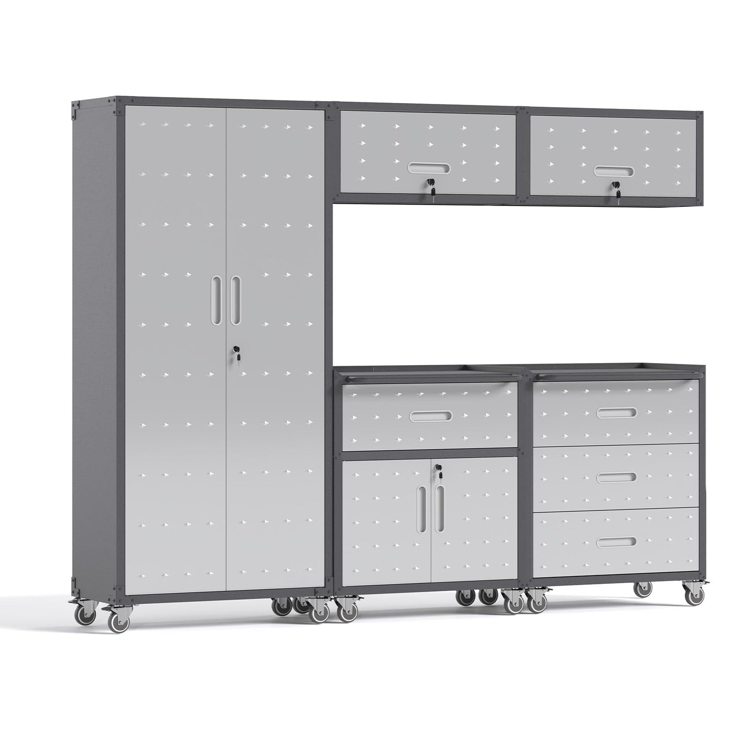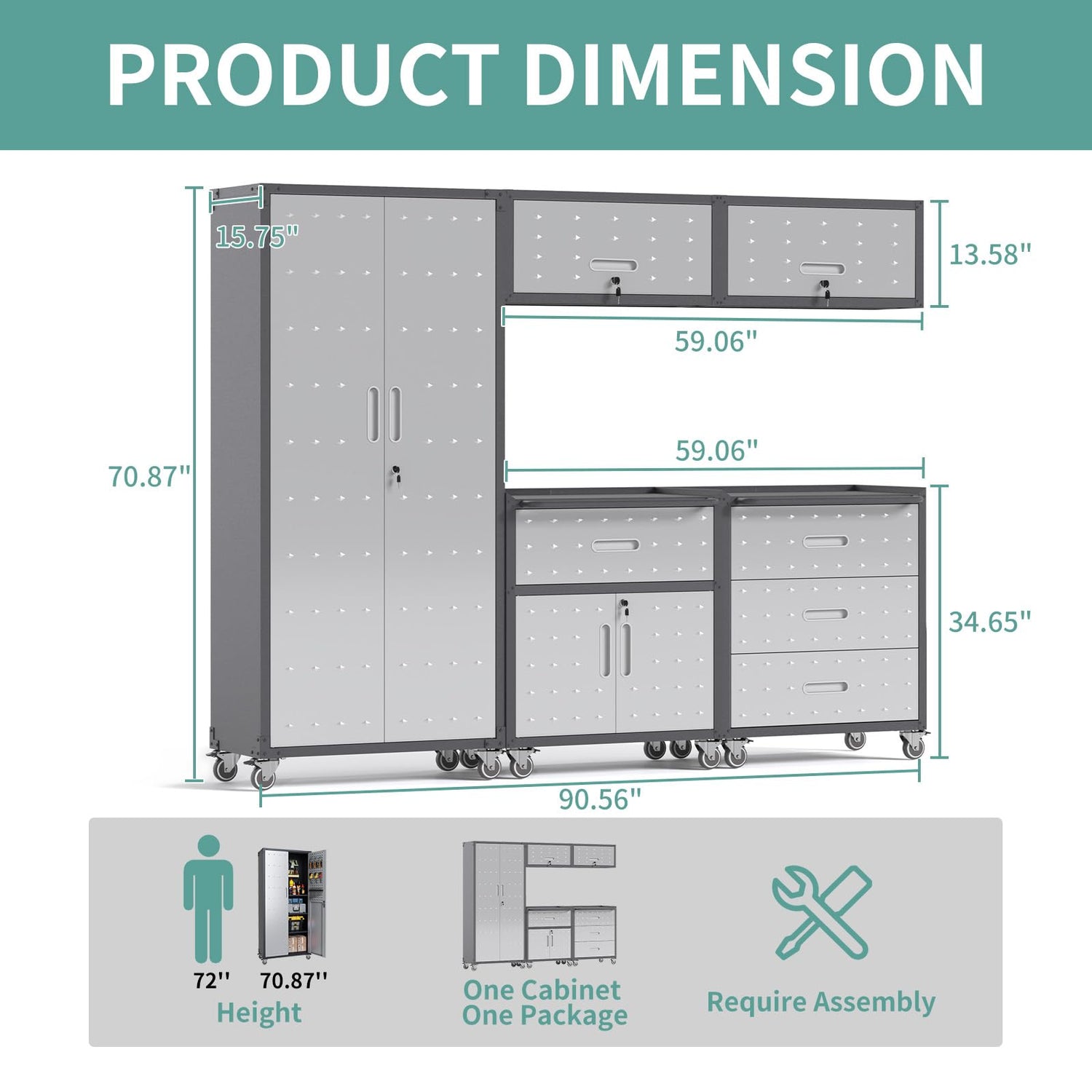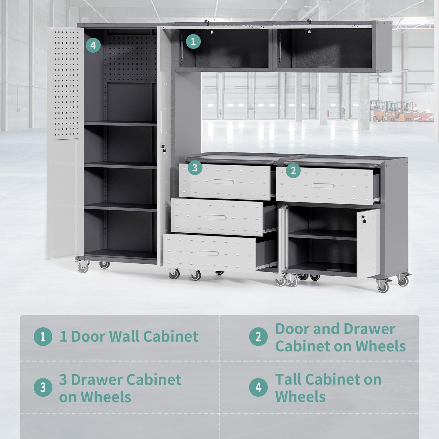 AQY Metal Garage Storage Cabinets System,5 Piece Workshop Steel Cabinet Set Included Lockable Garage Storage Cabinet with Drawers Shelves Rolling Chest and Wheels,Assembly Required