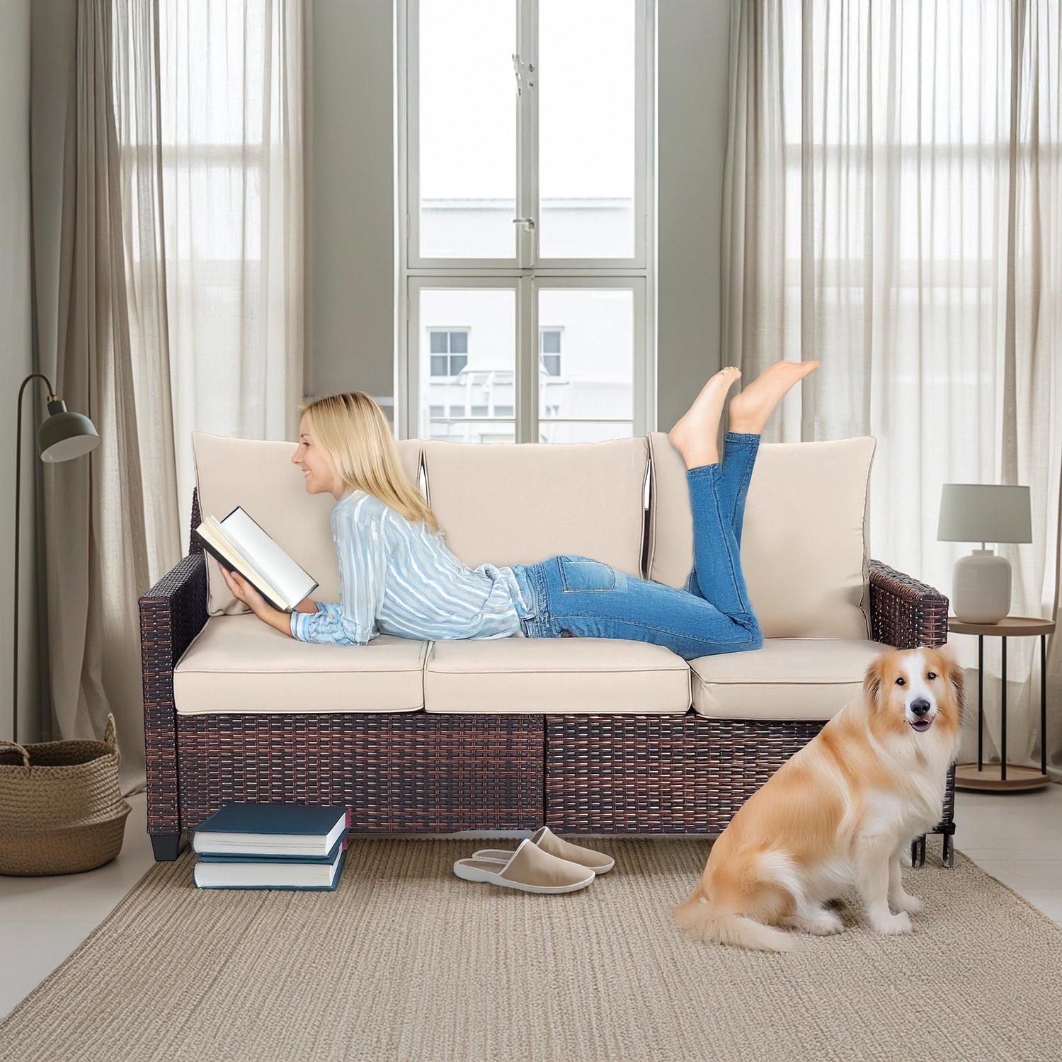 - All-Weather Sofa Durability - Military-Grade Steel Frame & Handwoven PE Rattan:The outdoor sofa defy coastal storms and desert sun alike. Powder-coated tubular steel resists rust for decades, while UV-fortified HDPE wicker repels fading even in poolside glare – built for year-round hosting without compromise.