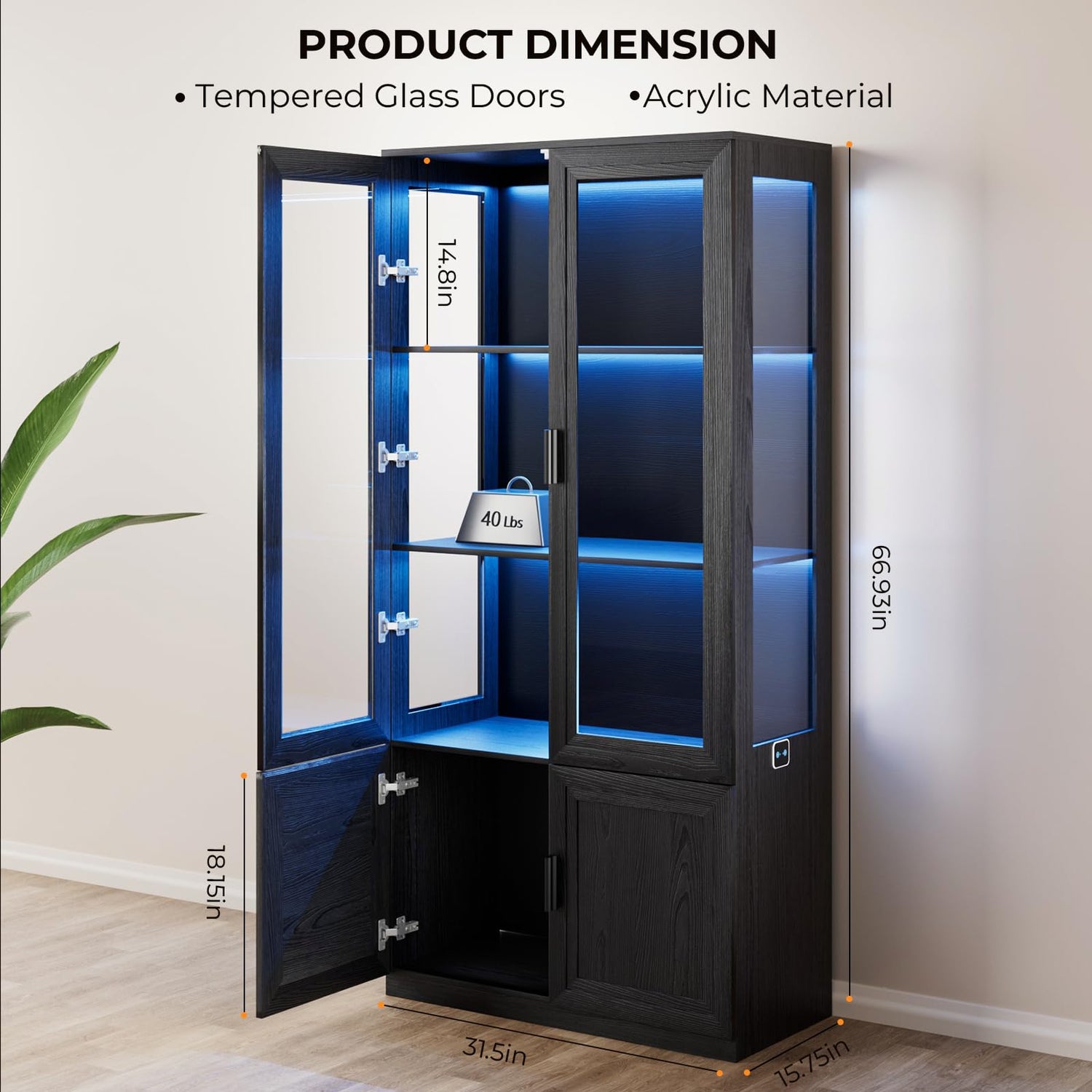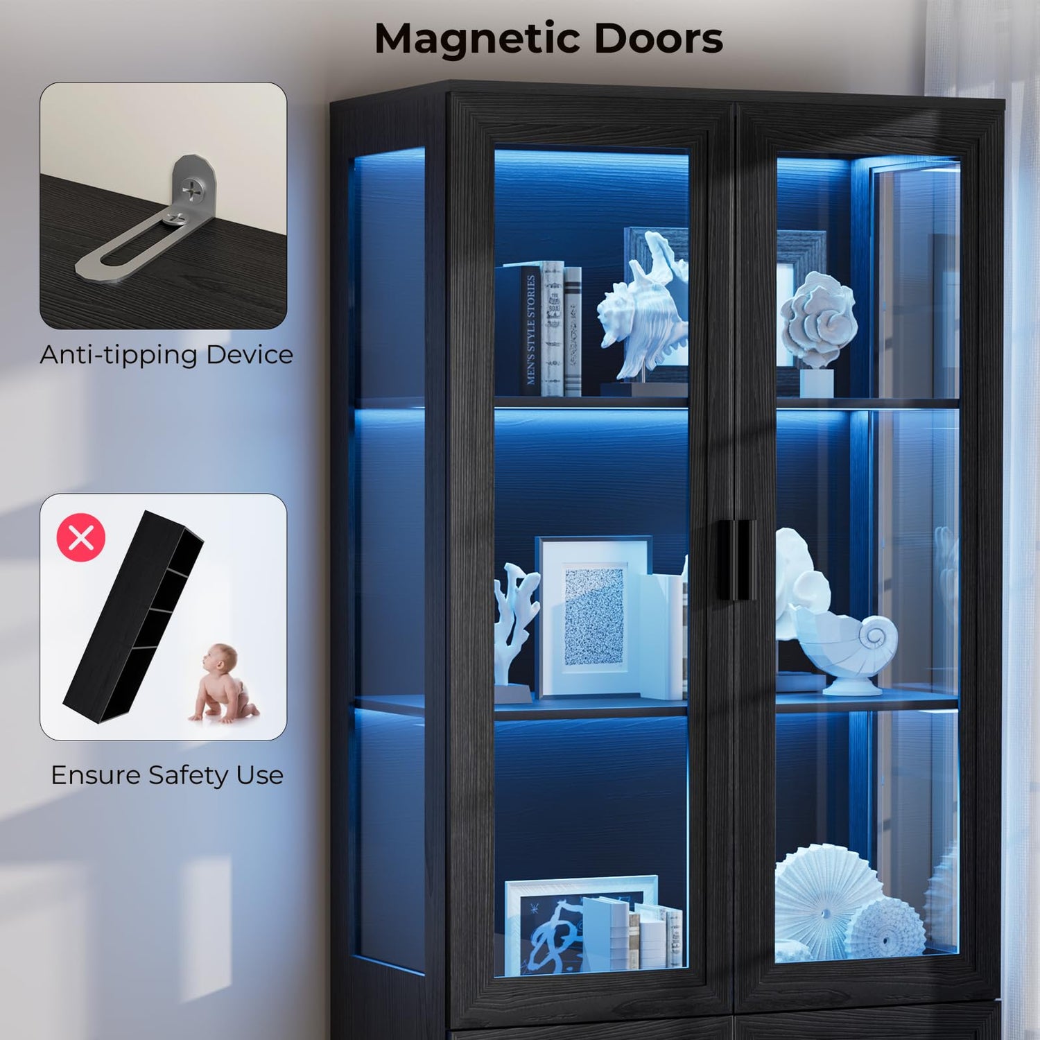 BROTTAR 67" Tall Curio Display Cabinet with Glass Doors, Large Storage Cabinet with LED Lights & Motion Sensor for Collectibles, Book, 4-Tier China Cabinet Bookcase for Living Room (Black)