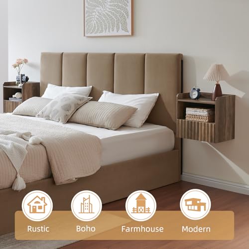 BuildHom Modern Fluted Floating Nightstand Wall Mounted Set of 2- Bedside Table with Storage Drawer & Display Shelf, Minimalist Bedroom Furniture for Studio Apartments(Rustic Brown)