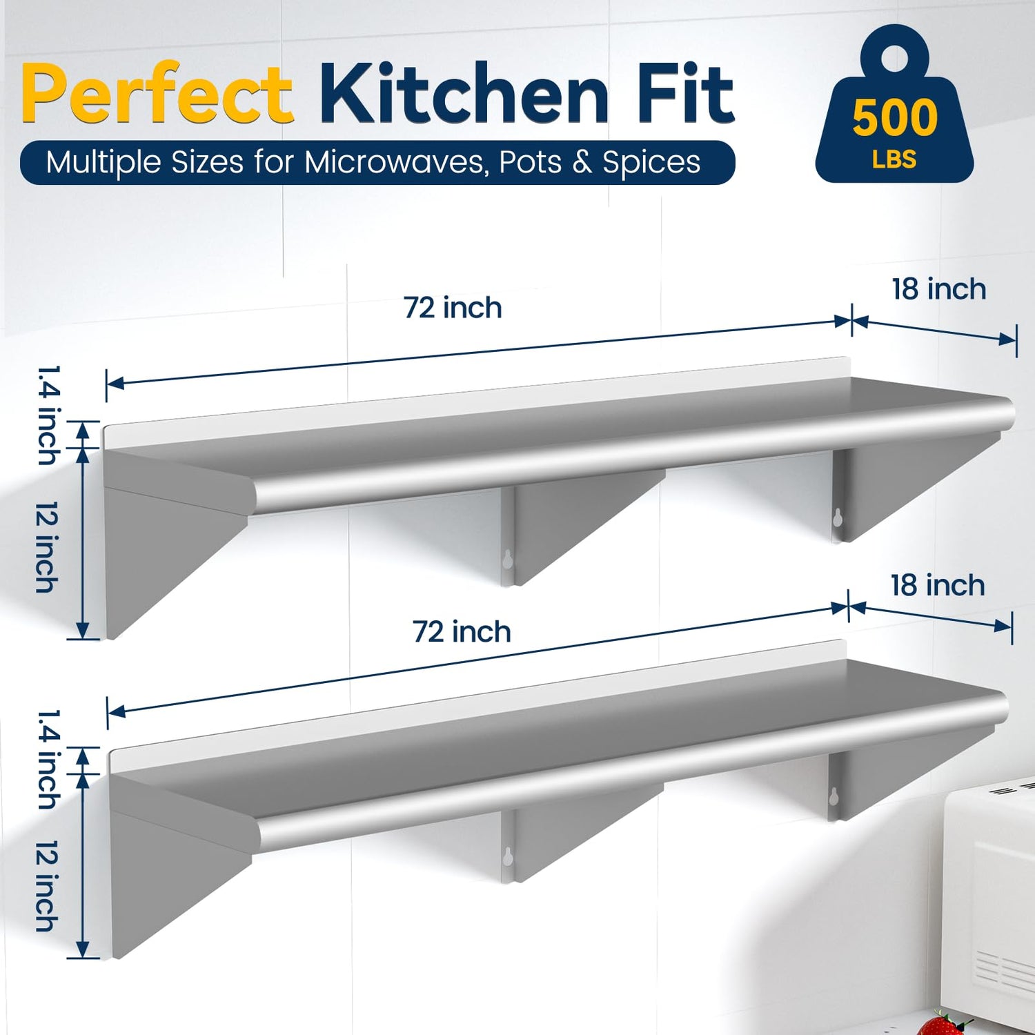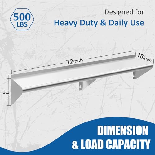- Maximize Your Space: The 18" x 72" stainless steel shelf offers ample storage space for your kitchen, utility room, laundry, or garage, with a 500 lb bear capacity for heavy appliances like microwaves and ovens