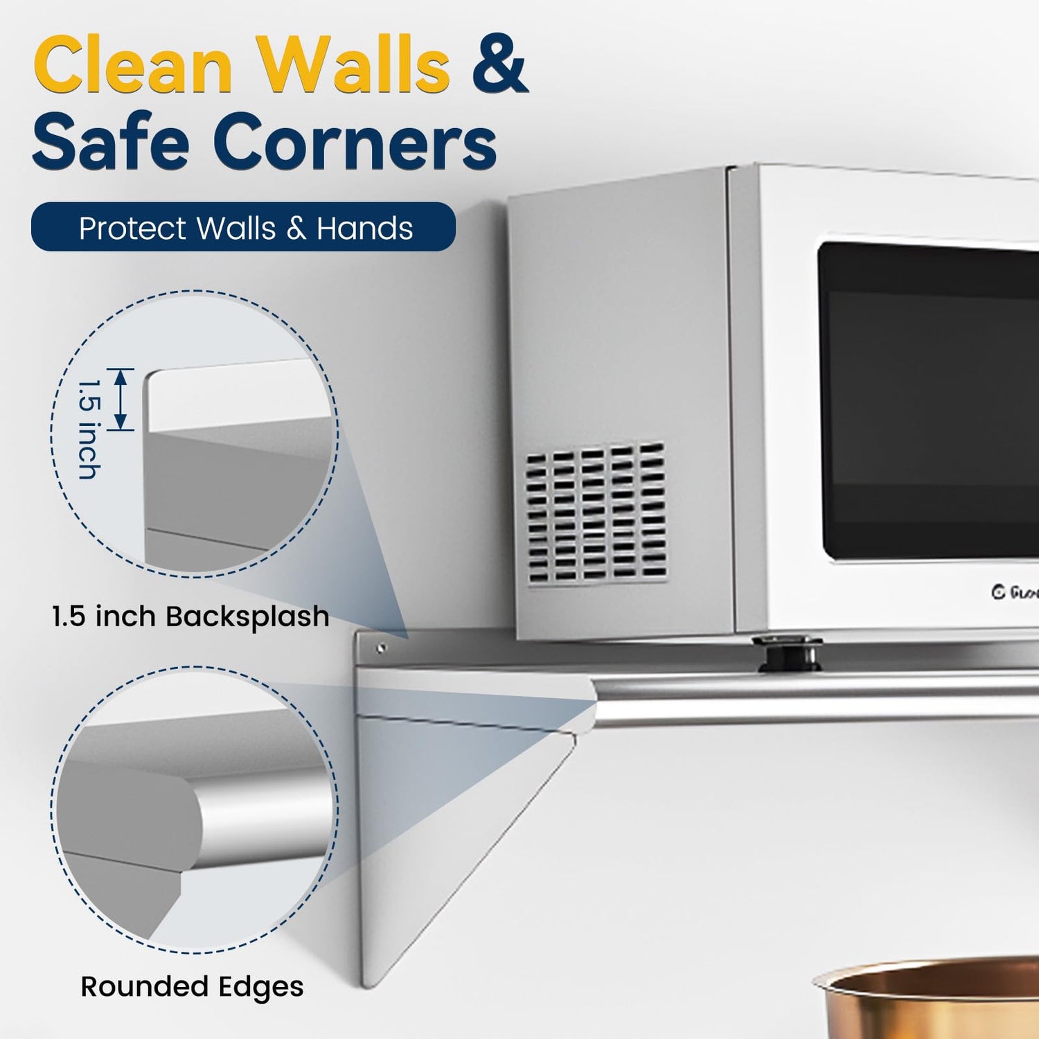 - Premium Quality: Crafted from 18 gauge Type 201 stainless steel, our wall-mounted shelf complies with public health standards, resisting corrosion and rust. The food-grade shelving allows for quick cleaning and hassle-free upkeep