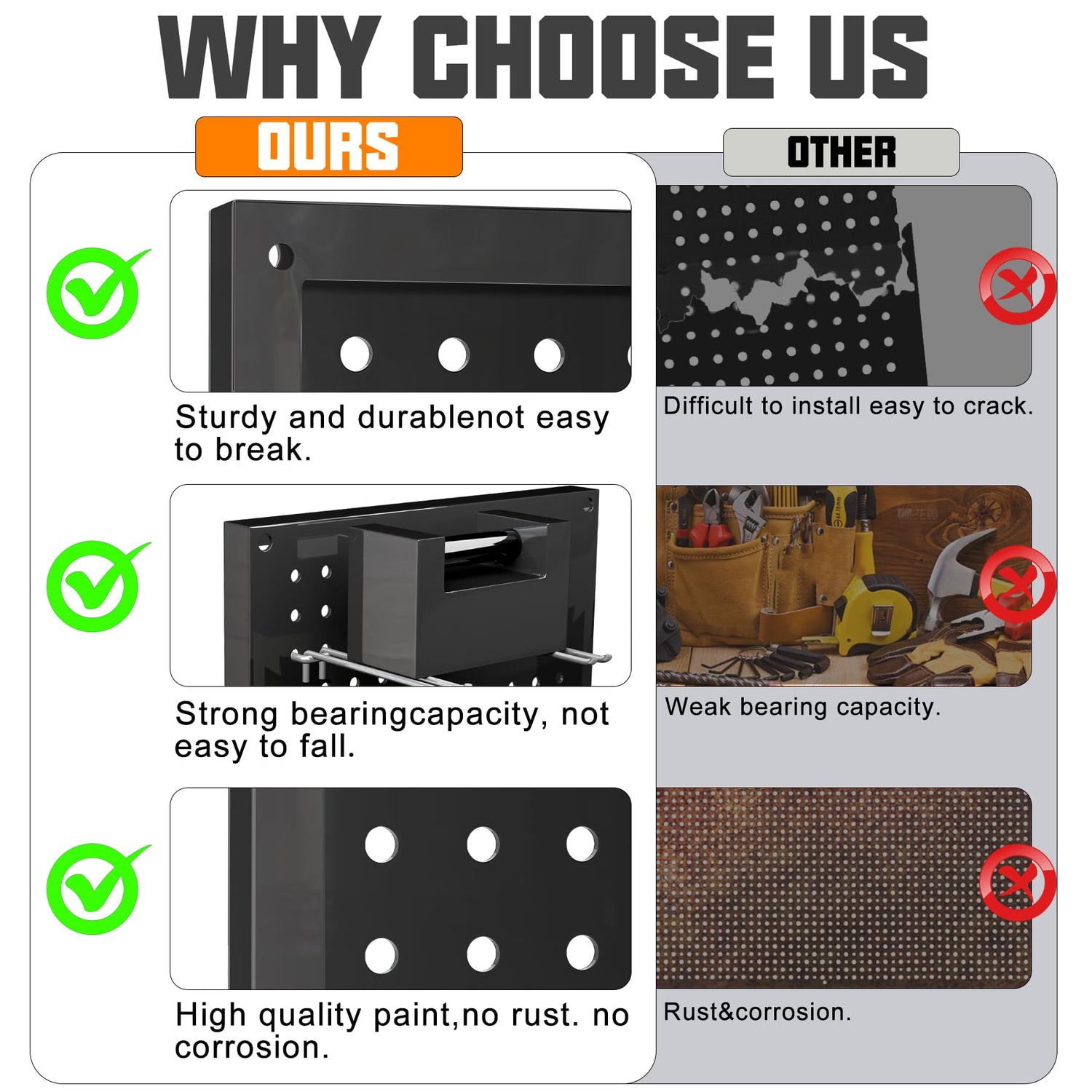 - Sturdy and Durable: Tool organizer board is made of high-quality steel with a black powder-coated finish, resistant to rust, crack, scratch resistant and easy to clean. Modular pegboard has a strong load-bearing capacity, subjected to heavy loads, it maintains structural stability without deformation or damage