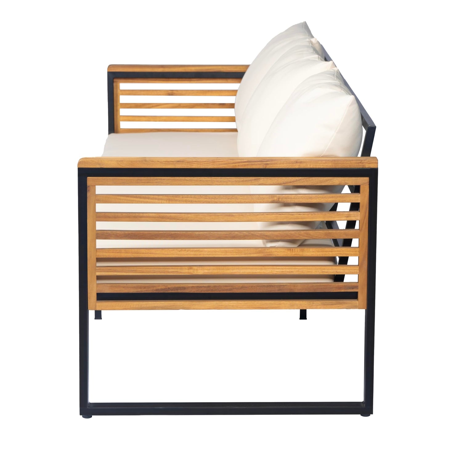 Details: Upgrade your outdoor living space with this 3-Piece Patio Furniture Set, including a 3-seater sofa, a coffee table, and a square ottoman. Crafted from acacia wood frames with slatted armrests and iron legs, this modern outdoor furniture set offers durability and style. The removable water-repellent cushions provide all-day comfort, while the versatile ottoman doubles as extra seating or an additional table. The slatted rectangular-top coffee table enhances functionality, making this patio conversation set perfect for entertaining or relaxing.