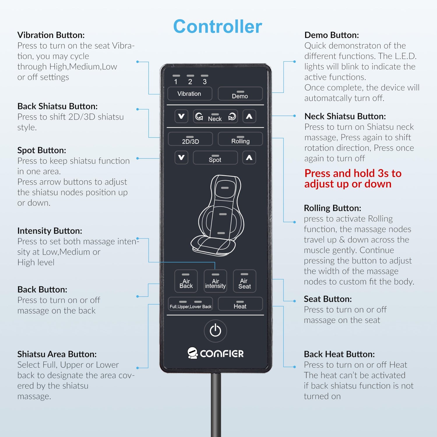 - Optional Heat & Adjustable Compression Massage - The full back massager has a heating pad that delivers gentle warmth to the back. ADJUSTABLE COMPRESSION-massage on waist & hips that you can choose. Adjustable 3 intensity settings are available.