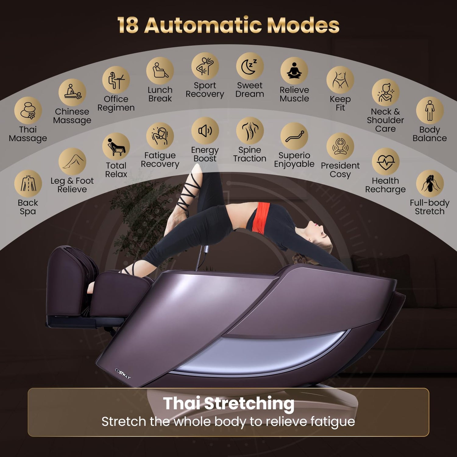 18 automatic modes: Total Relax, Chinese Massage, Relieve Muscle, Body Balance, Thai Massage, Full-body Stretch, Neck & Shoulder Care, Spine Traction, Leg & Foot Relieve, Superior Enjoyable, President Cosy, Keep Fit, Office Regimen, Health Recharge, Energy Boost, Lunch Break, Back Spa, Sweet Dream