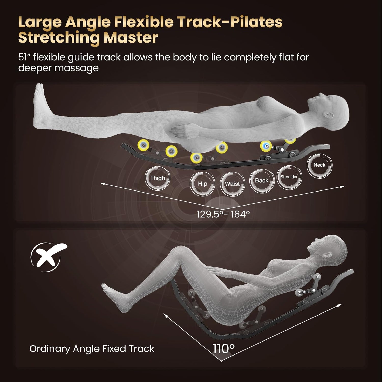 - Innovative 4D Massage & Large Angle Flexible Track: Featuring advanced 4D massage technology, the manipulator can be adjusted up & down, left & right, forward & back, providing a more precise massage. The 51" flexible guide track can be adjusted from 129.5°-164° to allow the body to lie completely flat for a deeper massage, tracing from neck to hips and thighs. The automatic body scanning system adjusts massage points and ranges.
