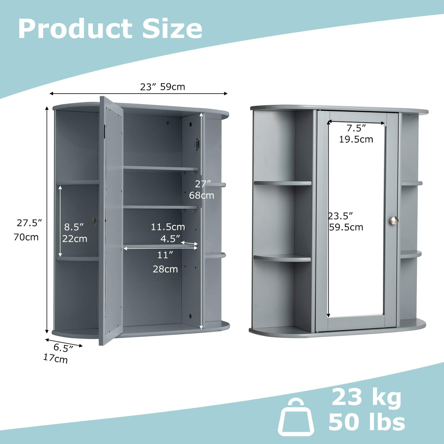 COSTWAY Wall Mounted Bathroom Cabinet - Storage Organizer with Mirror Door, Adjustable Shelves & 6 Open Racks, Space-Saving Hanging Medicine Cabinet for Living Room Kitchen Entryway (Gray)