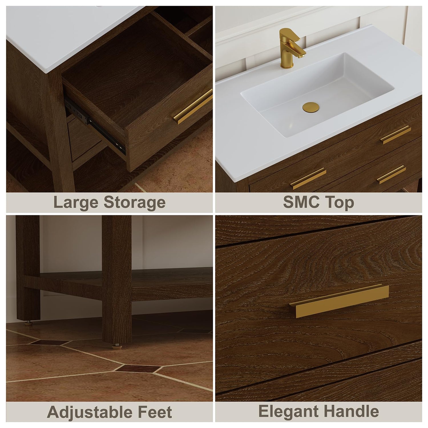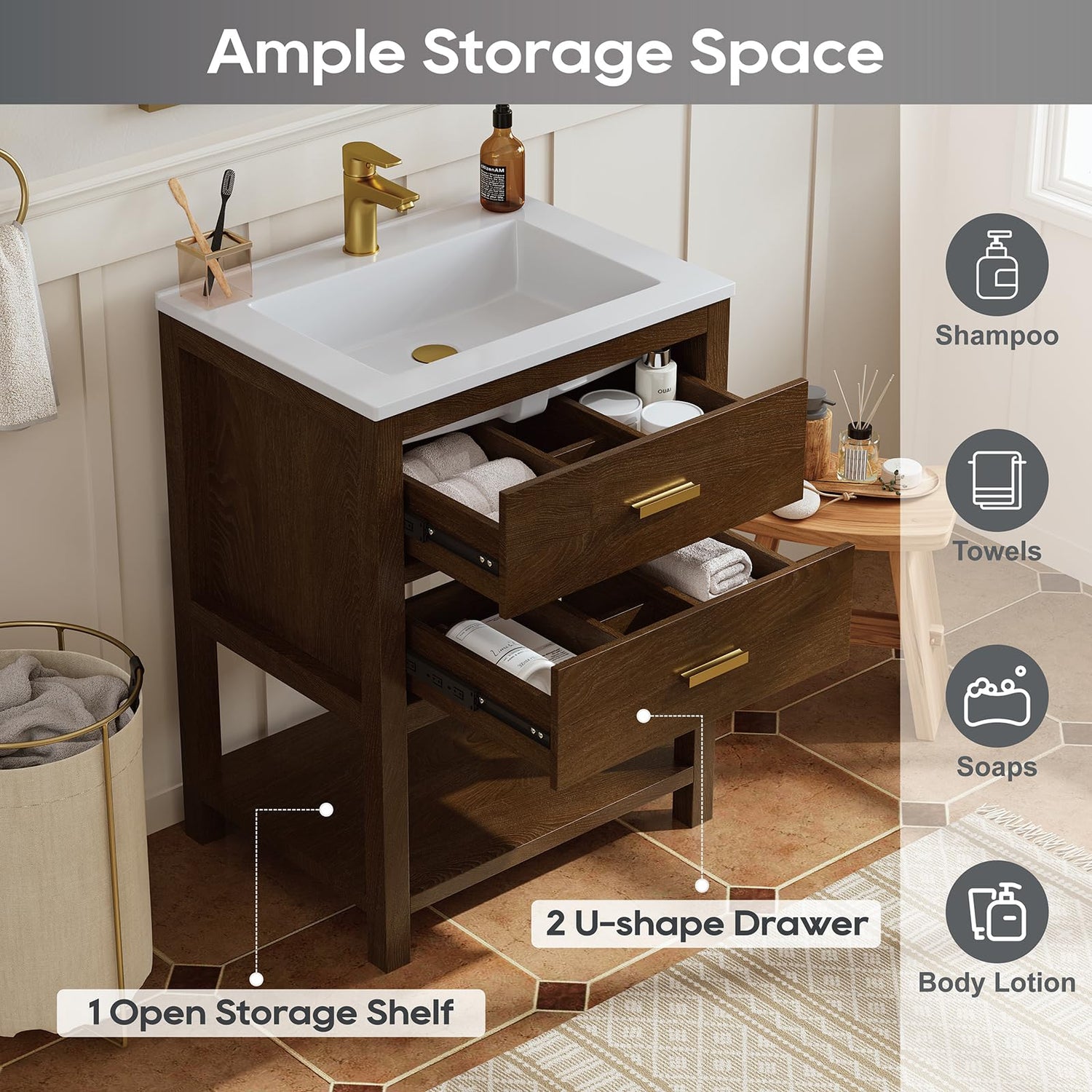 DELUXE LIVING 24 Inch Bathroom Vanity with Sink, Farmhouse Storage Cabinet with Drawers & Open Storage Shelf, Easy Assembly, Adjustable Feet, Walnut