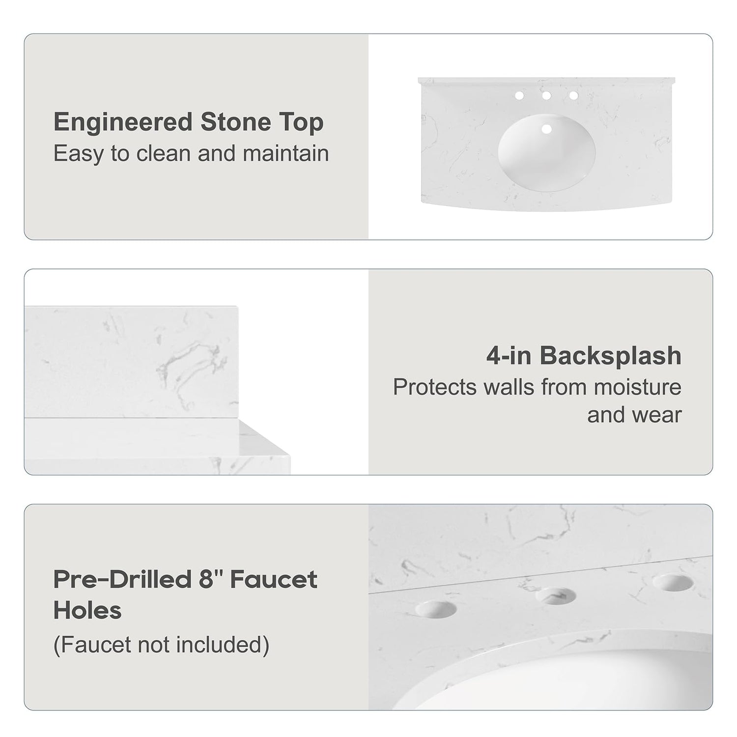 - Premium Materials Built to Last - Crafted for endurance, this vanity features: Stain-resistant & scratch-proof engineered marble ;A rock-solid poplar wood frame that withstands daily use, Durable metal fittings and a sleek ceramic basin, merging strength with timeless elegance. We prioritize quality through meticulous craftsmanship and uncompromising materials—designed to deliver years of reliable performance.