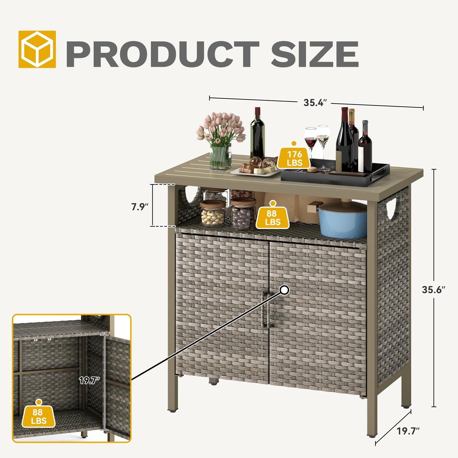 - VERSATILE STORAGE: This outdoor storage cabinet features a spacious tabletop, open shelf, and enclosed storage, offering flexible and efficient organization for outdoor essentials. Ideal as a bar, potting station, or kitchen island, its adaptable design enhances any decor with style and functionality.