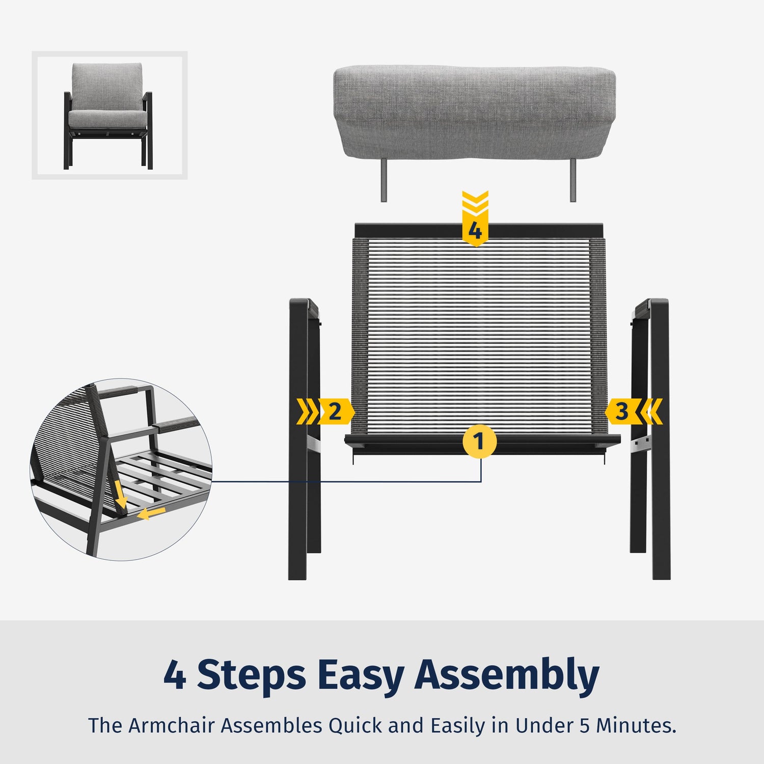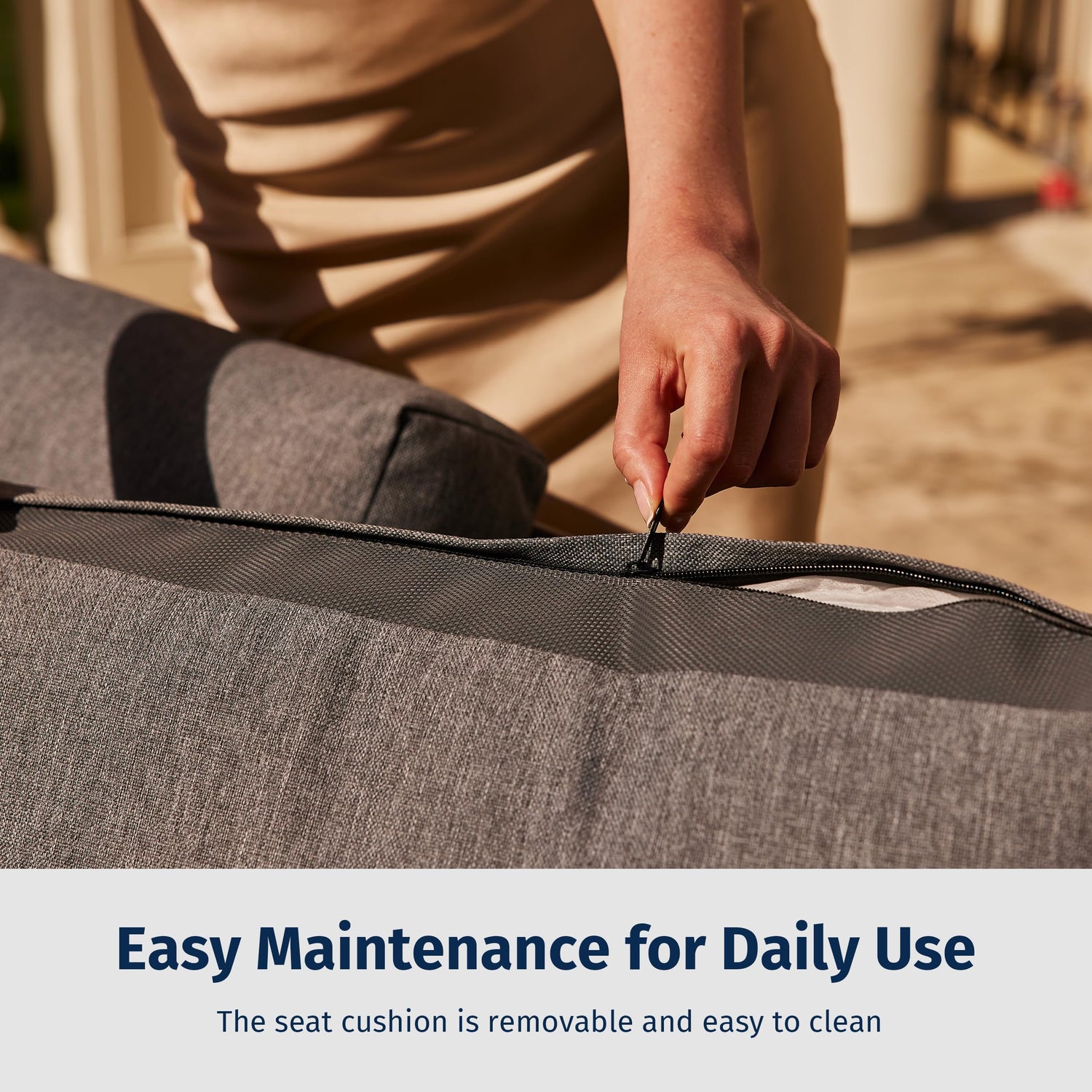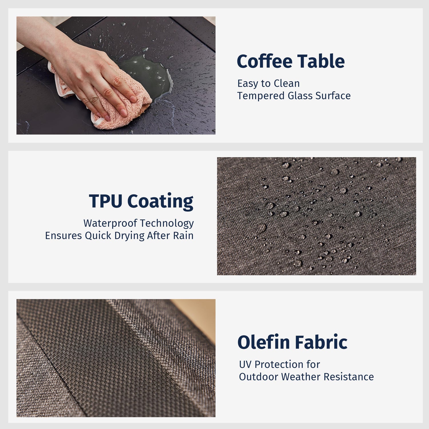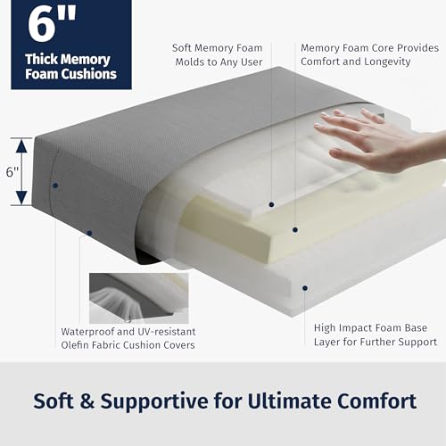- Ultimate Comfort: Featuring upgraded Olefin fabric and a 6-inch thick cushion, this outdoor patio furniture delivers a luxurious seating experience. The high-density foam provides robust support while ensuring breathability and comfort. The ergonomic design ensures optimal comfort.