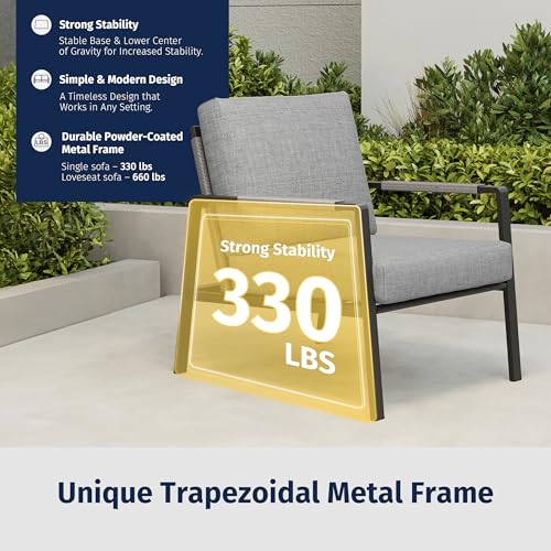 - Durable Construction: Crafted with all weather powder coated metal, this furniture set is exceptionally durable. The Olefin fabric, coated with TPU, delivers waterproof, lightfast, and UV-resistance durability. Each single sofa chair can support up to 330 pounds, while the loveseat accommodates up to 660 pounds.