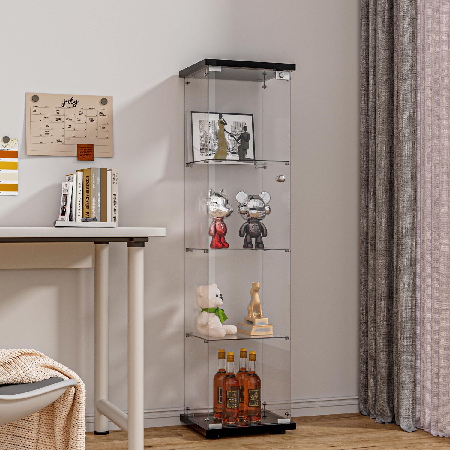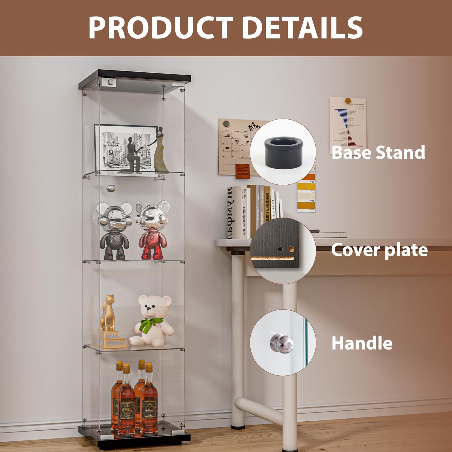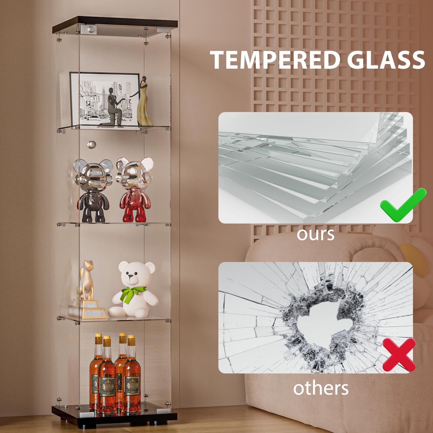 - [LARGE Size] The size of the 4-layer glass display cabinet is 64.7" H x 16.7'' L x 14.4'' W, each tempered glass is 5mm thick. So large room for displaying action figures, wine, whisky or everything you want to store in it
