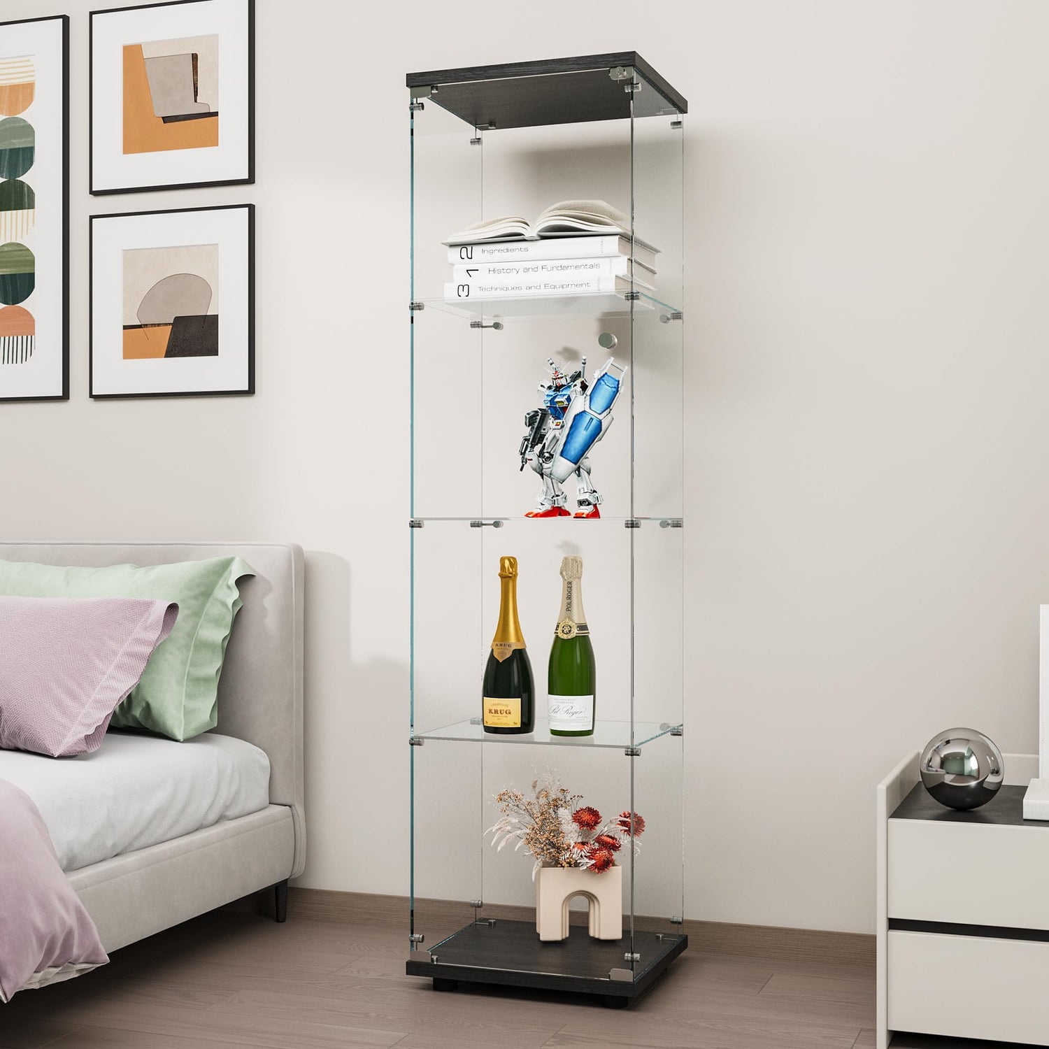 FANYUSHOW Tempered Glass Display Cabinet 4-Shelf Curio Cabinet with Security Lock 5mm Display Shelf Showcase for Living Room/Bedroom/Office- Black 64.7" H x 16.7" L x 14.37" W