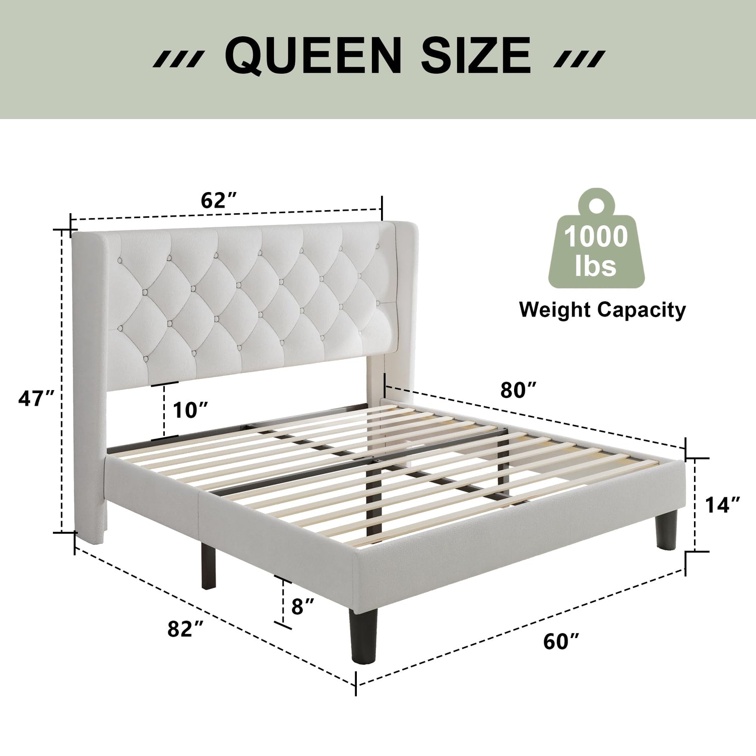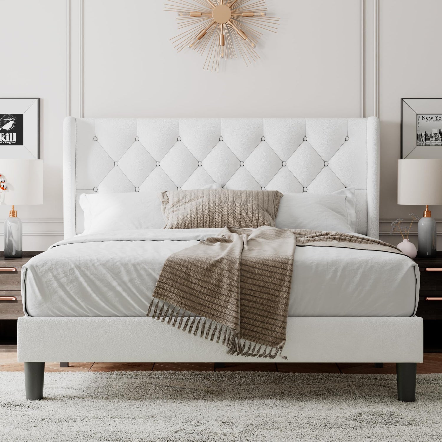 Feonase Queen Size Bed Frame with Diamond Tufted Wingback Headboard, Upholstered Platform Bed, Sturdy Wooden Slats Support, Noise-Free, No Box Spring Needed, Easy Assembly, White