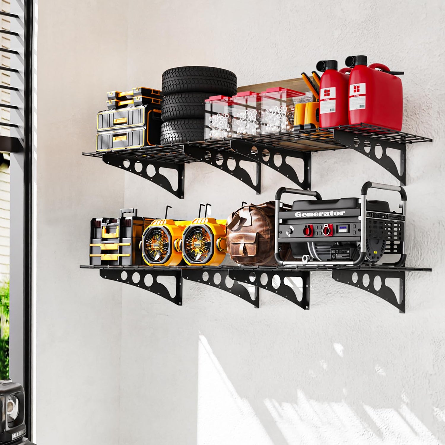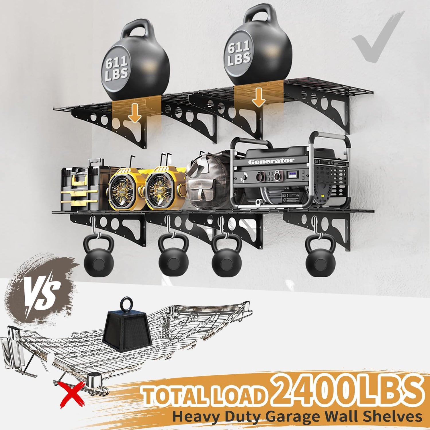 - 1.High Quality Heavy Duty Metal - Up to 1200LBS Load: Heavy duty garage wall shelving are made of industrial grade carbon steel , upgraded double mesh wire dividers and thicker support frame structure to ensure the garage wall shelving have extraordinary load capacity. A single unit can be loaded with 600LBS.Solve the danger of unstable items that may fall down after loaded with ordinary garage shelf wall mount, and provide sturdy and stable storage space for your items. It is your best choice!