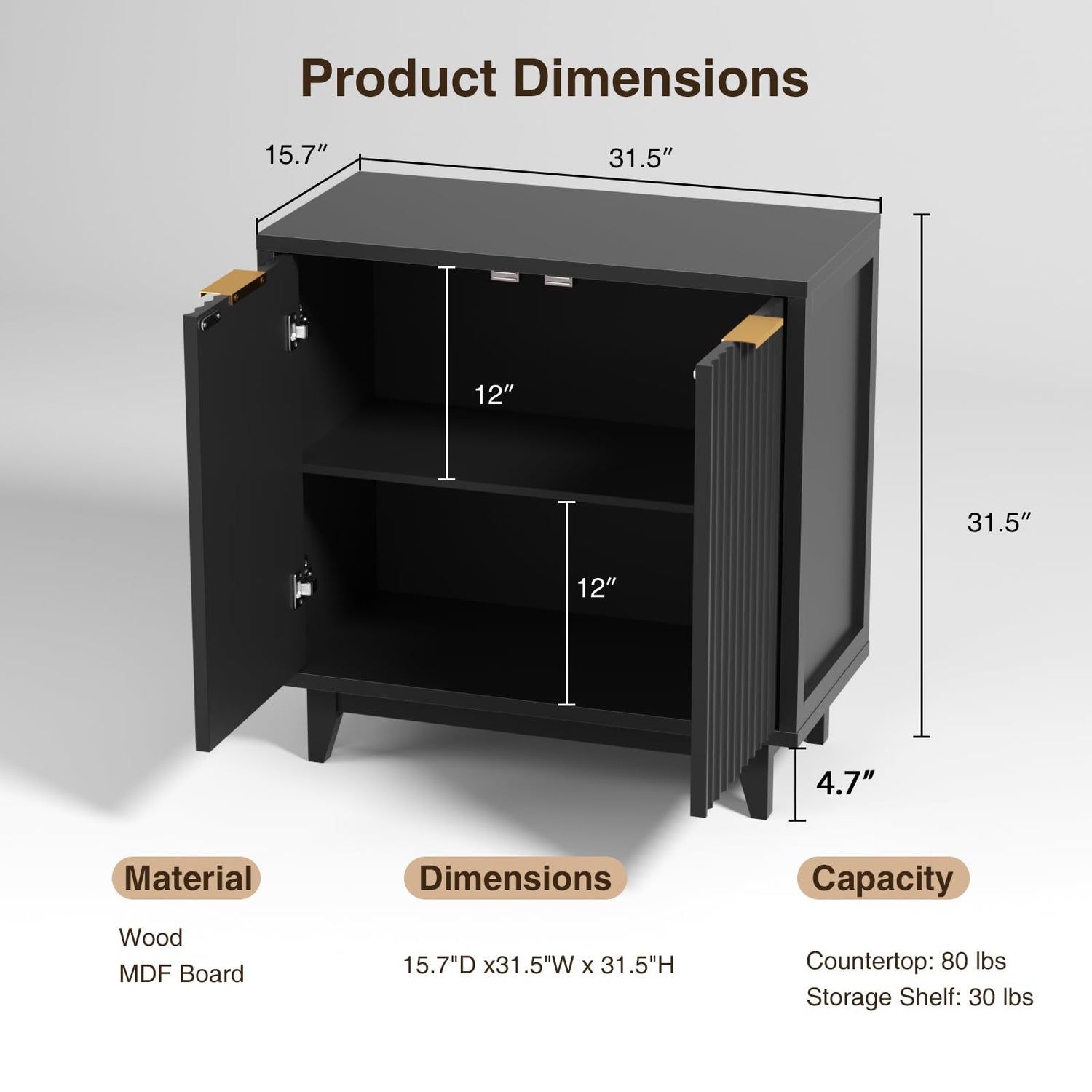 - Large Space with Adjustable Shelves: This sideboard cabinet provides ample storage space to help organize and create a tidy environment. The overall dimension: 31.5" W x 15.7" D x 31.5" H. The accent cabinet built-in divider shelves that can be adjusted in 3 heights, each with a 2" difference. Freedom to adapt to the height of the items you need to store to maximize storage efficiency.
