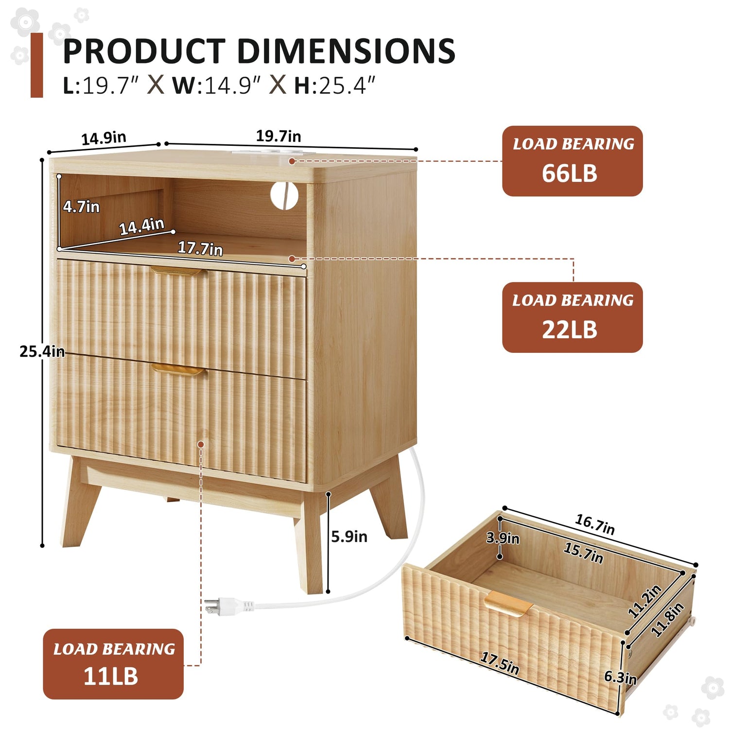 Fluted Nightstand with Charging Station, 19.7 inch Wide End Table with 2 Drawers, Modern Wood Bedside Table for Bedroom(Natural)