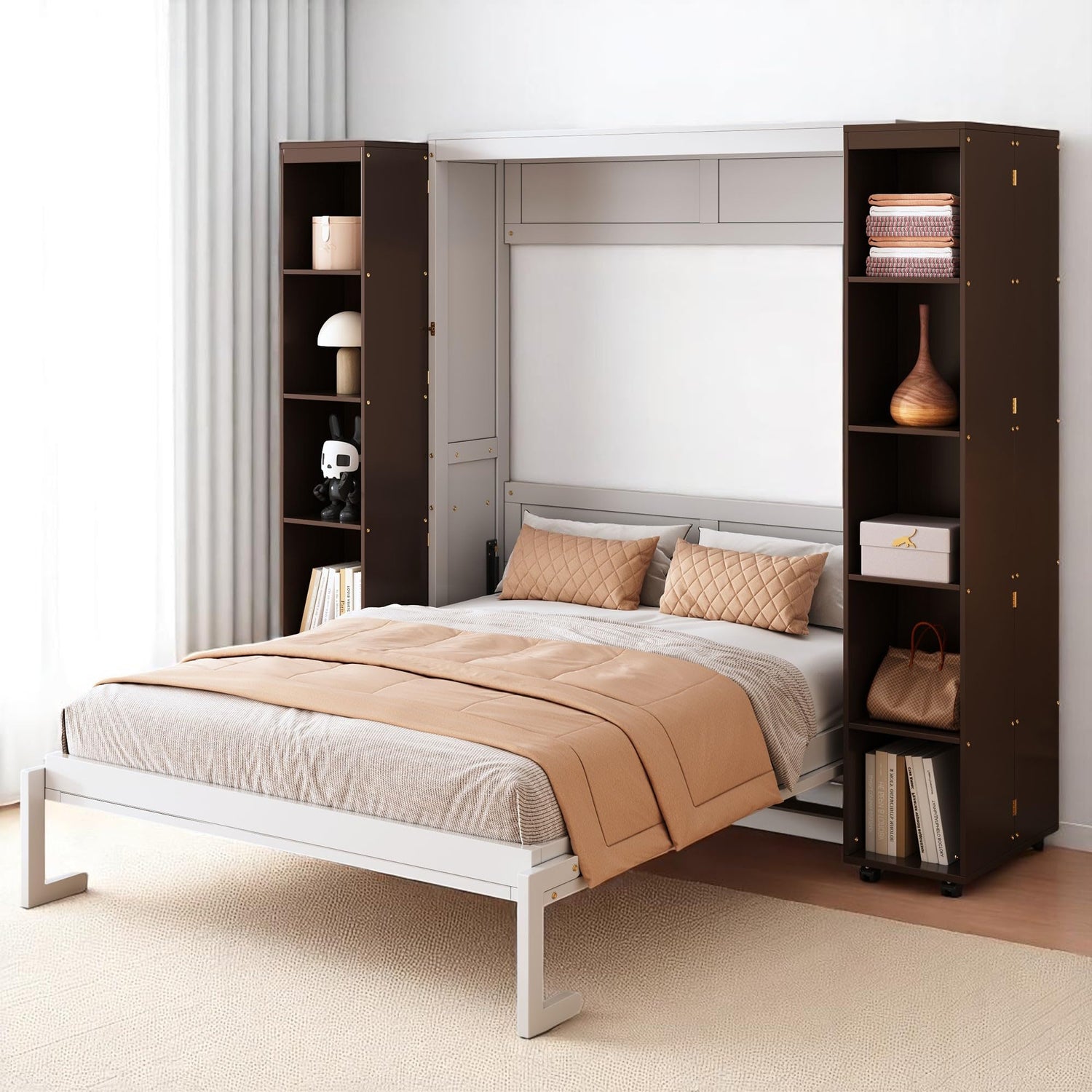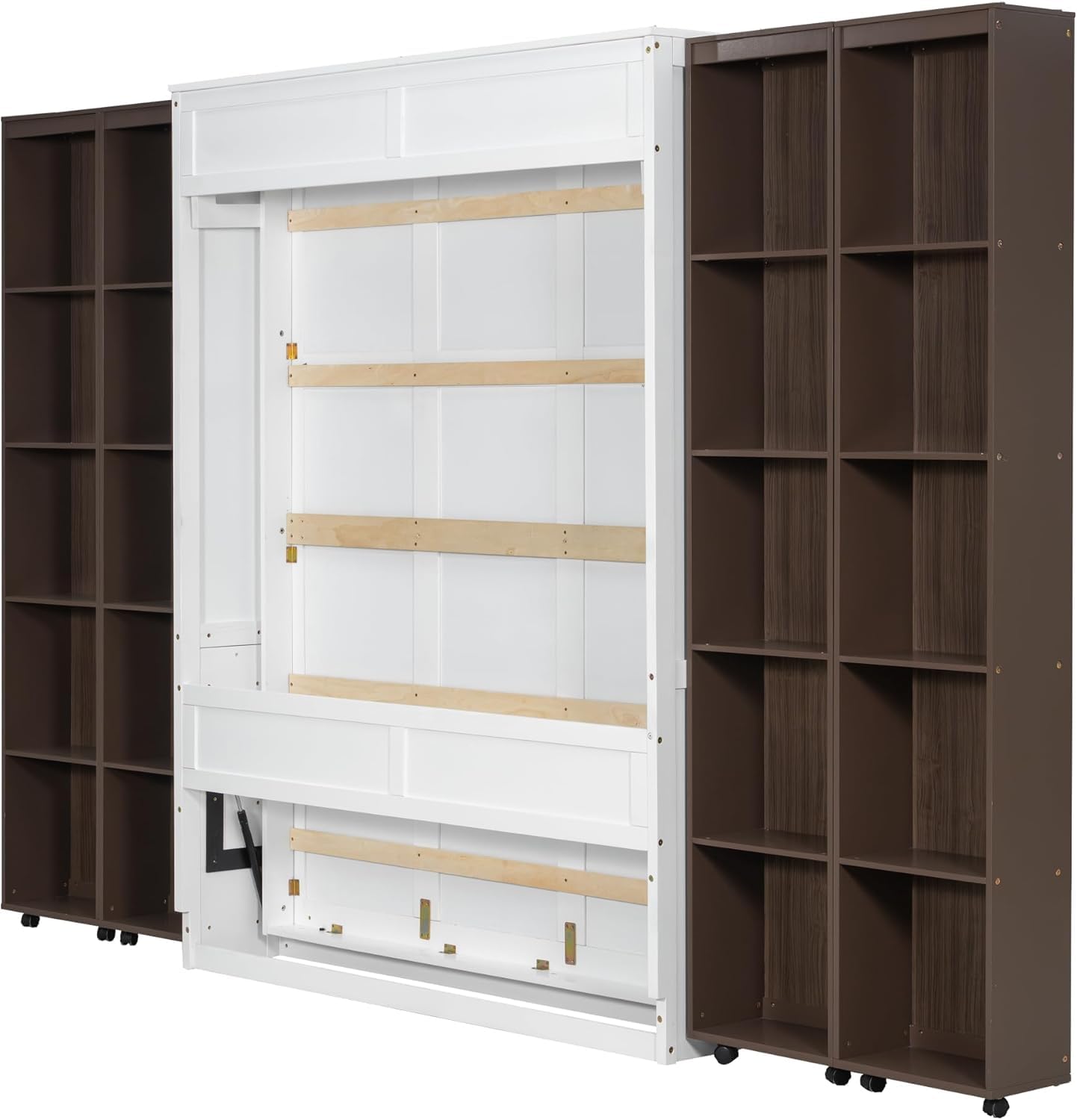 Foldable Hidden Queen Murphy Bed Cabinet with Storage Bookshelf Bookcase, Wood White Murphy Wall Bed with Storage Shelves for Adults (Espresso)