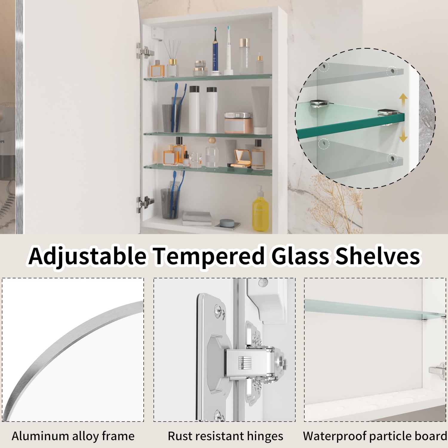 - ✨【MEDICINE CABINET WITH HD MIRROR】This modern mirrored medicine cabinet features a big high-definition arch mirror, providing a clear reflection for your makeup or cleaning needs. And the mirror is also easy to clean, ensuring a pristine appearance with minimal maintenance.