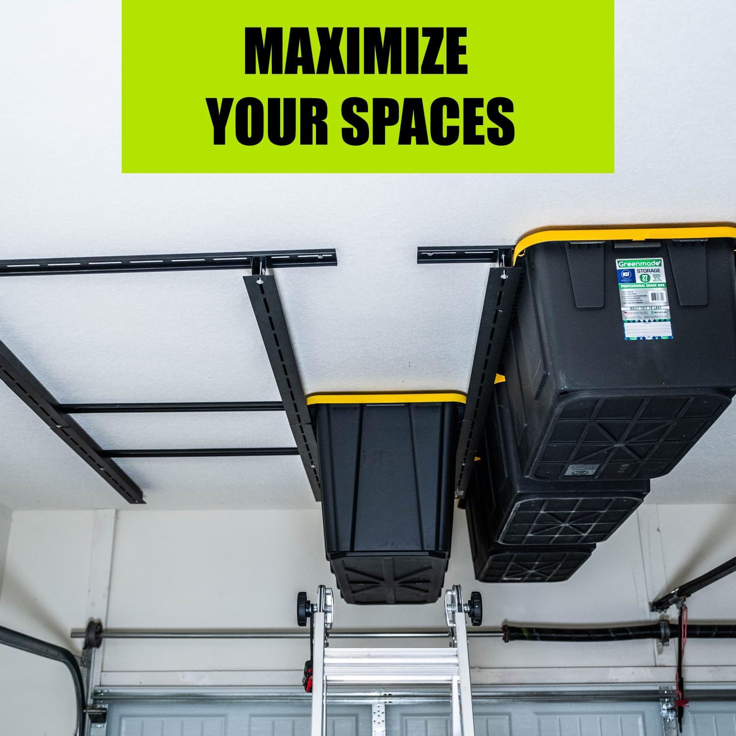 Details: -Heavy Duty Industrial Grade Steel Overhead Organizer - Ceiling bin storage rails feature heavy duty steel construction that supports heavy loads up to 550 lbs. - Durable powder coated finish resists scratches, rust and wear for long lasting, reliable storage. Lightweight and easy to install. Garage box storage securely installs into ceiling joints, adjustable to different measurements, up to 50 gallons for quick and hassle free assembly. - Ceiling storage rails fit your bins. - Utilize your unused ceiling space, with our bin storage system transforming forgotten ceiling space into convenient and secure storage capacity, hiding your bins, and allowing them to not be visible when your garage is open