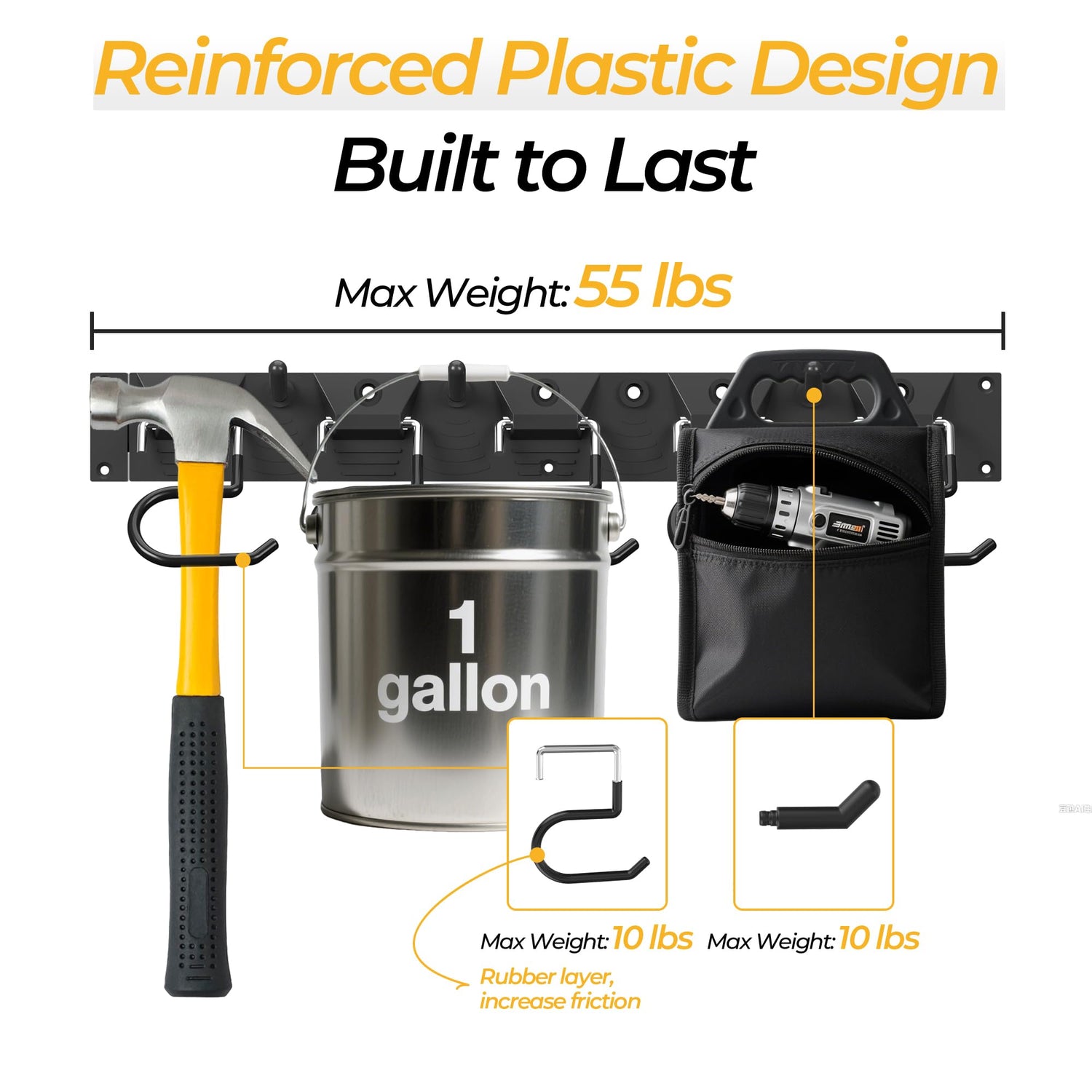 - 【High Strength Structure】 Made of high quality ABS plastic, this wall mount tool organizer supports up to 55 lbs in total (10 lbs per hook), making it ideal for storing heavy duty tools like shovels, rakes, and mops—perfect for any durable garage storage system.