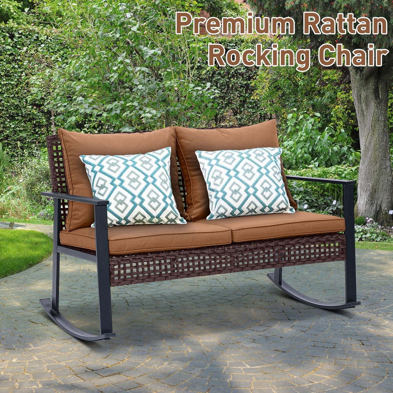 GDY Outdoor Wicker Loveseat Rocking Chair, Patio Outdoor Furniture Conversation Sets, Rattan Rocker Chair with Cushions, Modern Cozy Rocking Wicker Furniture for Garden, Porch, Poolside & Deck, Brown.