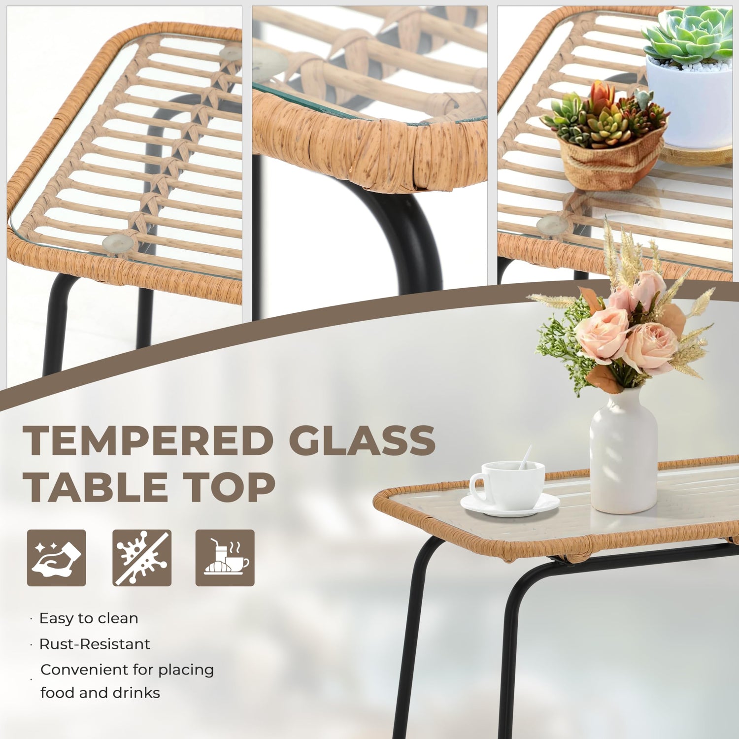 • 【FRAME STRONG AND DURABLE】 This metal patio furniture set is made of high-quality and sturdy powder coated iron frame, non-deformable and not easy to rust. The coffee table is metal frame and glass table top, the legs are solidly structured, stable and durable, and the glass table top is easy to clean.