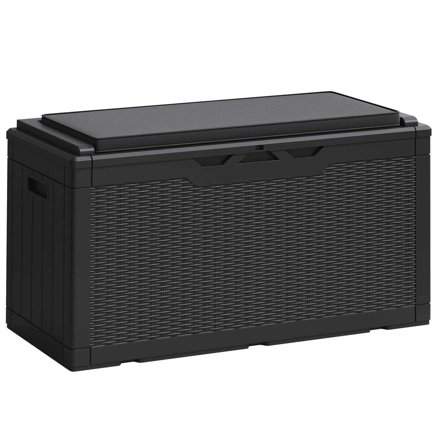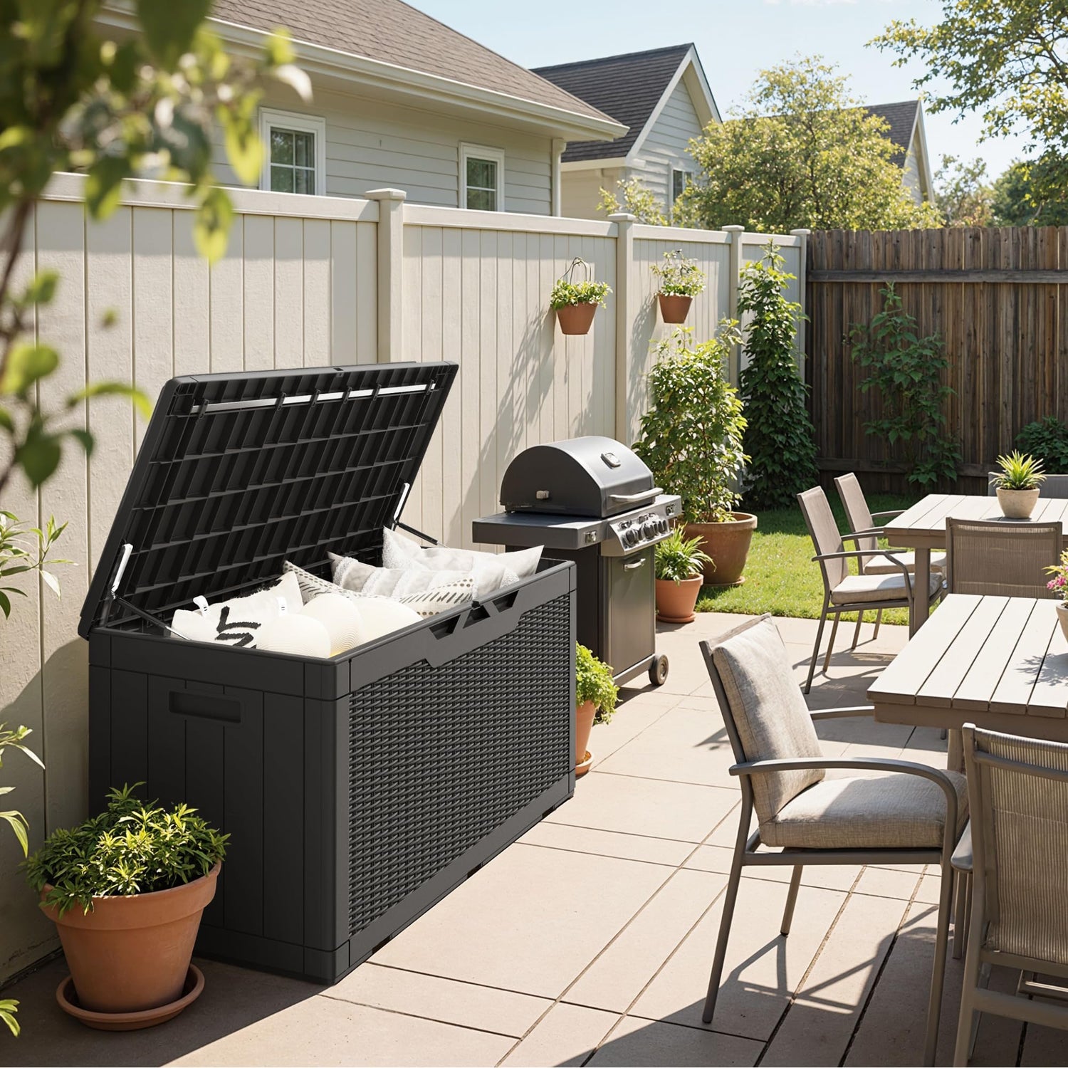 Greesum 100 Gallon Resin Deck Box Large Outdoor Storage Boxes with Cushions for Garden Tools, Patio Furniture Pillows, Pool Supplies, Black